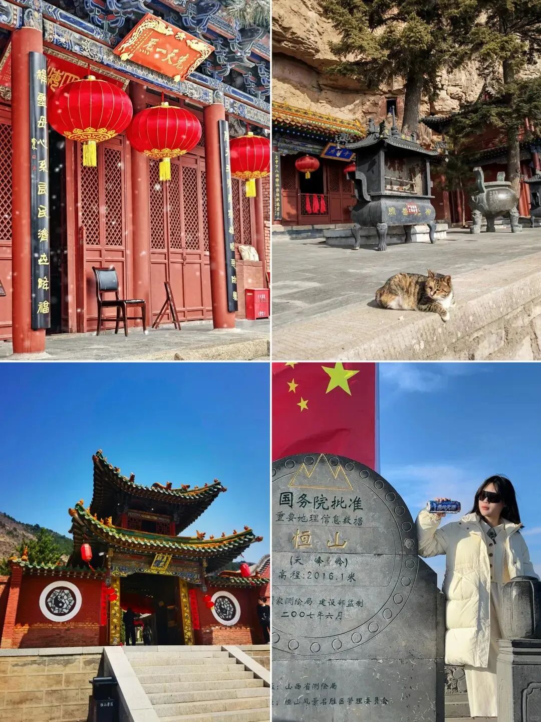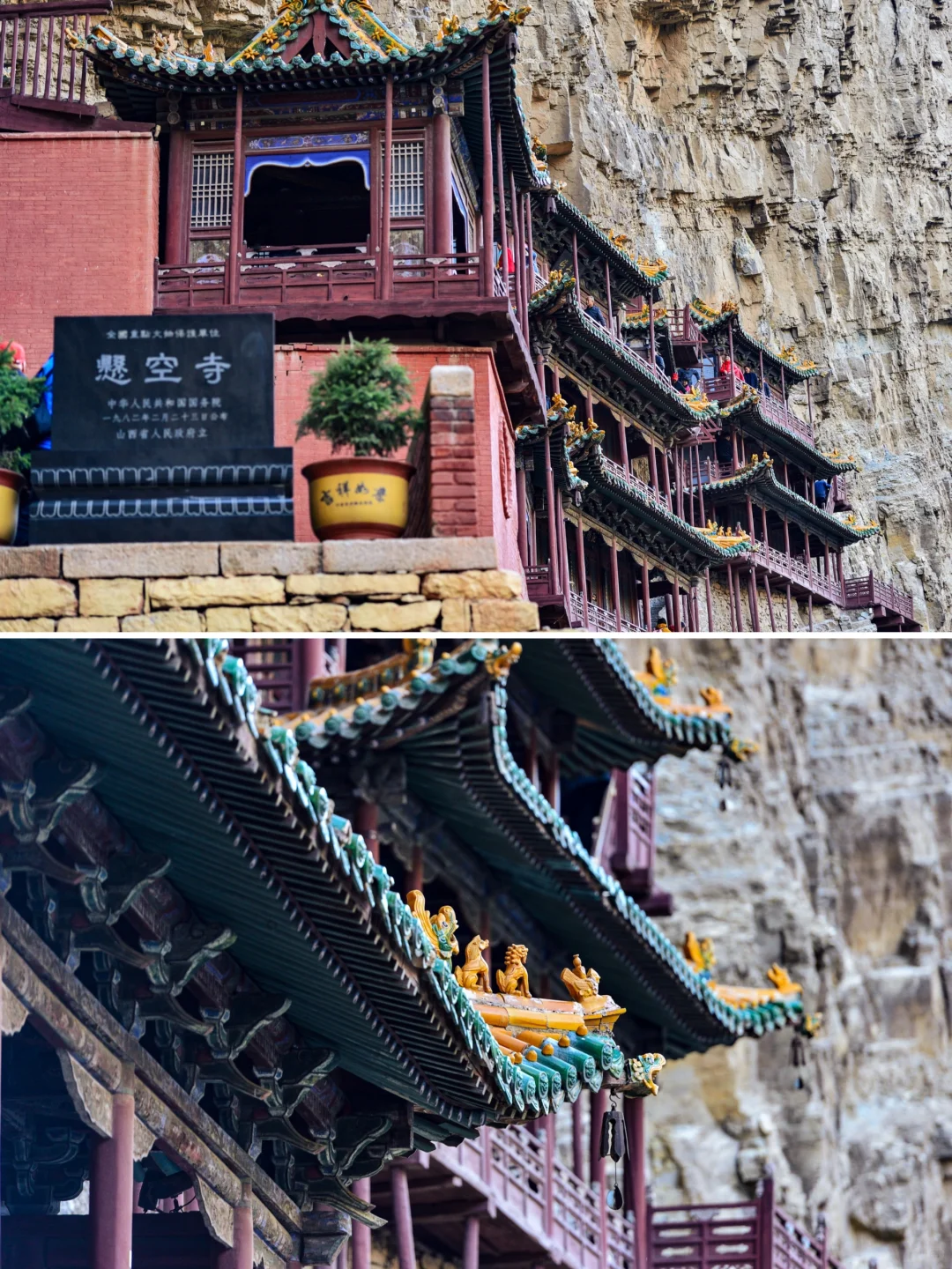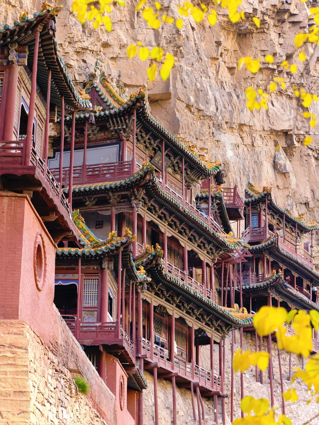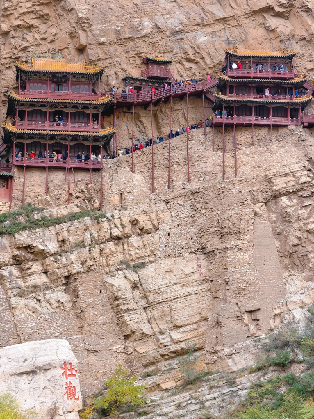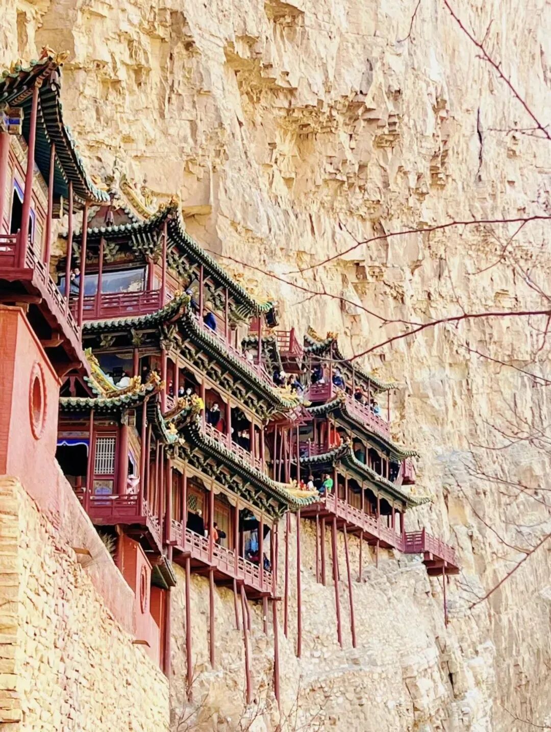 - 下午|到达【悬空寺】参观游览。悬空寺就像悬挂在悬崖之上,全寺为木质框架式结构,值得惊叹的是它依靠榫接结构,嵌入崖内而不倒,距今已有1500多年历史,是国内现存最早、保存最完好的高空木构摩崖建筑,诗仙李白观后醉书壮观,徐霞客赞为天下巨观。- 之后集合前往【恒山】游览。恒山是“五岳”中的北岳,也是道教圣地,相传八仙之一的张果老就是在恒山修行得道,恒宗殿山门前的103级陡阶,会仙府有许多壁刻,以“天地大观”、“壁立万仞”最为醒目,周边还有玉皇阁、御碑亭、琴棋台、通元谷等景观。- 适时集合前往酒店住宿。