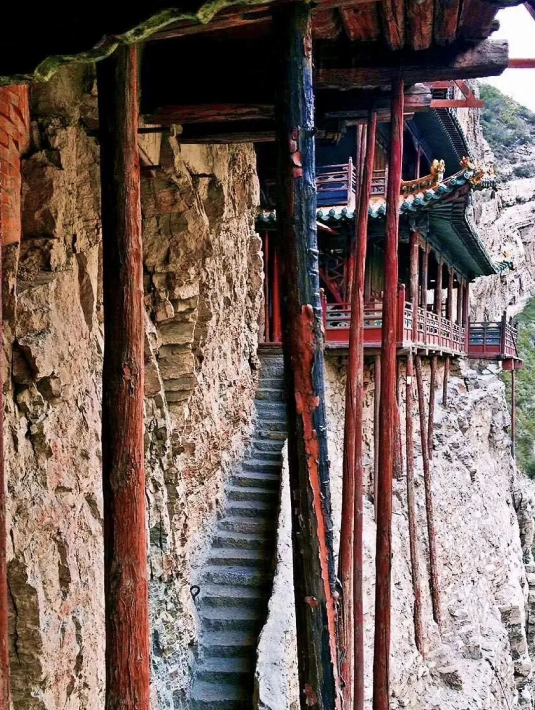 全寺为木质框架式结构,有殿琮楼阁40 间,其实悬空寺不大,最值得惊叹的是它依靠榫接结构,嵌入崖内而不倒。