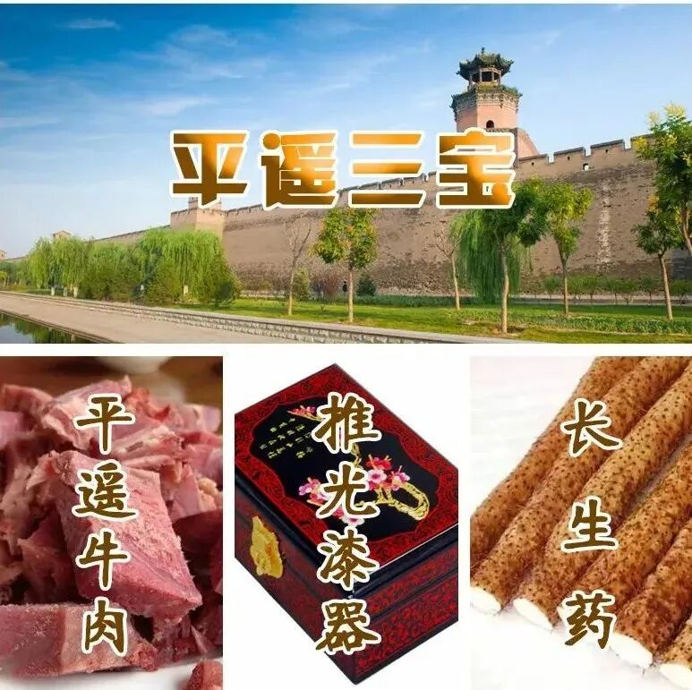 #平遥特色平遥三宝:平遥牛肉、迷人的漆器、神奇的长山药常见特色:山西酒(杏花村、汾酒、竹叶青)、各种醋。山西美食:山西的饮食习惯偏淡,餐餐都需要辣椒和醋的陪伴,主要的美食小吃有平遥牛肉,曹家熏肘,叫花鸡,碗托子,酱梅肉,平遥大烩菜,包皮面,握溜溜,油糕,煮疙瘩,糊塌子,剔尖,刀削面,剪刀面,搓鱼儿,石头饼,蘸尖尖,蘸片则,豆面抿尖,猫耳朵,玉米发糕,和和饭,切疙瘩,玉米窝窝头,拨烂子,凉糕,过油肉,菜饭,油茶,玉米黄煎,酒枣,拉面,馏圪蚪,干面饼子,黄菜火烧,莜面栲栳栳,水煎包,红面糊糊,擦圪蚪,豆腐脑等。