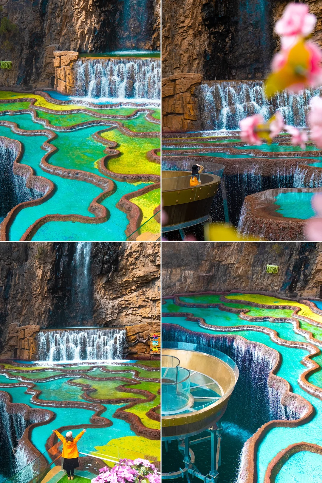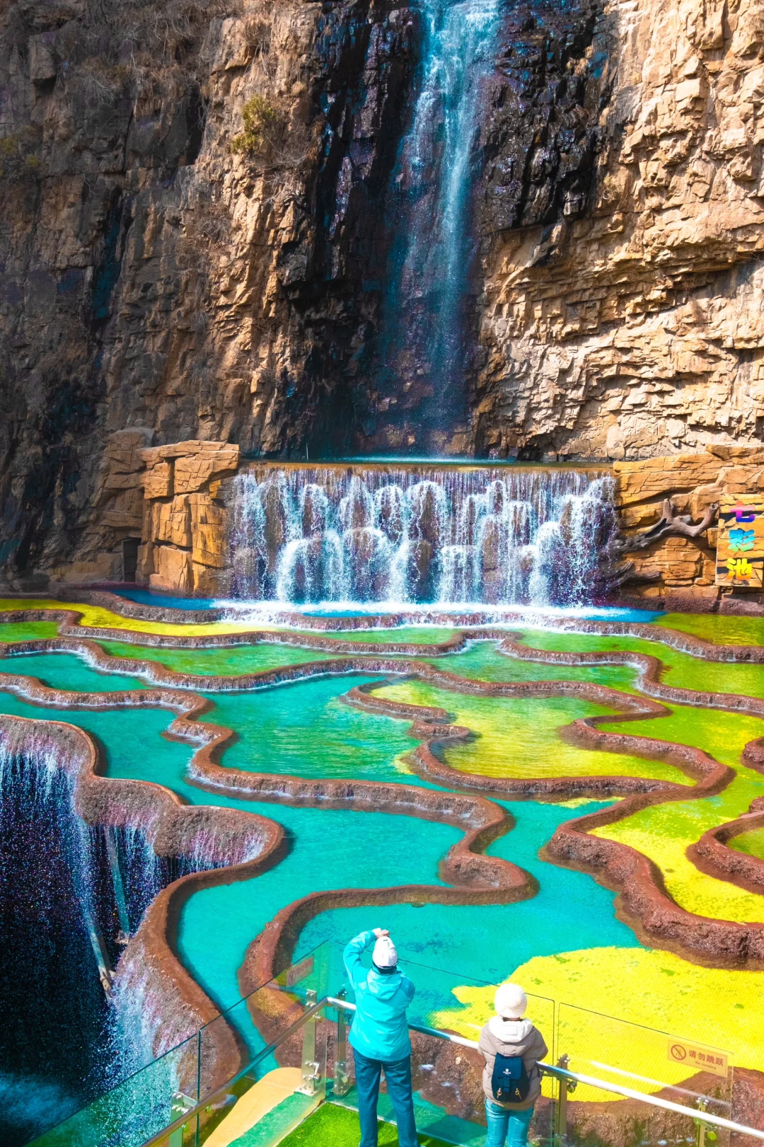 七彩池瑶池是由大大小小的水池组成,所有的池水来自同一条瀑布,水流到各个水池里,颜色却不同了。池边由金黄色的石粉凝结而成,像一圈圈彩带,把大大小小的水地围成各种不同的形状,有像葫芦的,有镰刀的,有像月牙的,有像盘子的,有像莲花的……