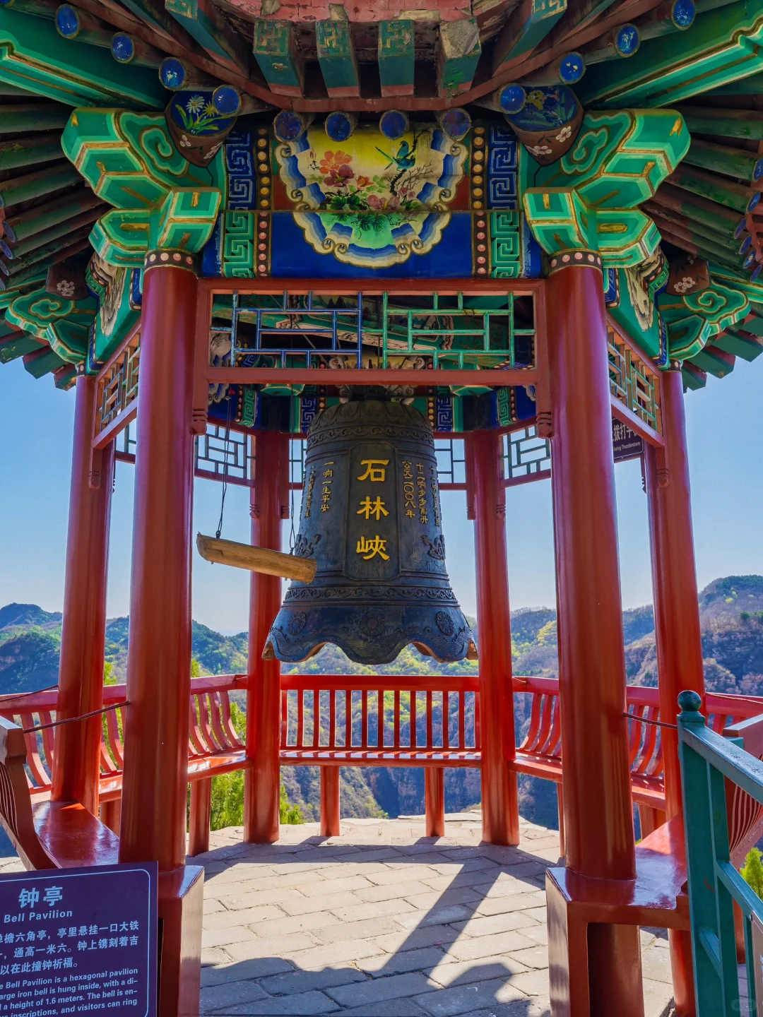 祈福点钟亭 下了龙王山索道,在接近山顶的位置,有一座古香古色的单檐六角亭,亭里悬挂一口大铁钟,直径一米一,通高一米六。钟上镌刻着吉祥铭文,游客可以在此撞钟祈福。