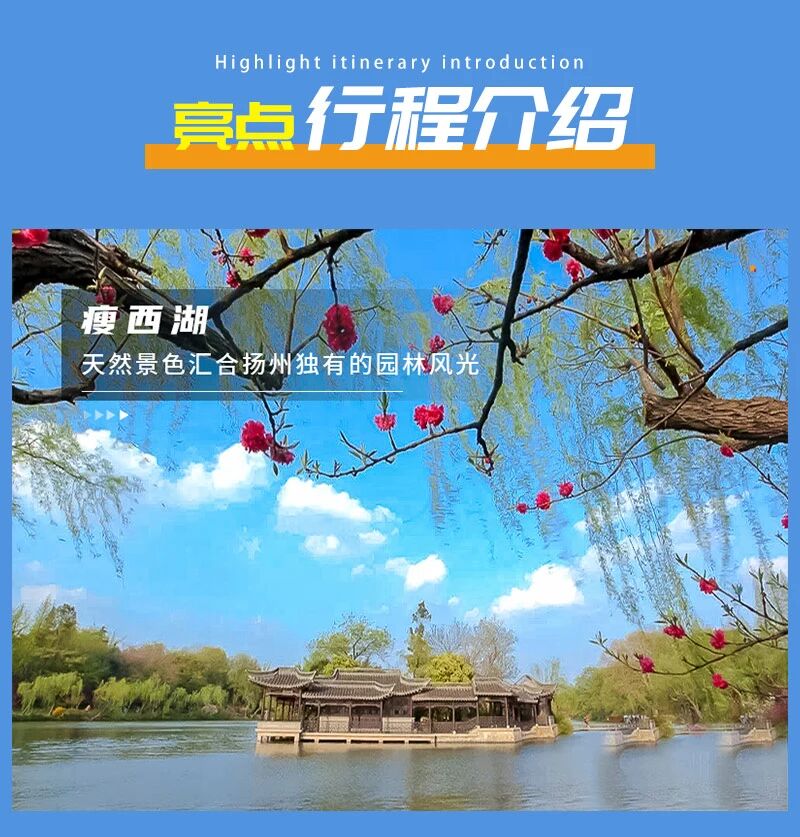 - 上午|早餐后,乘车前往扬州去瘦西湖游玩,江南水乡下的瘦西湖让你流连忘返。