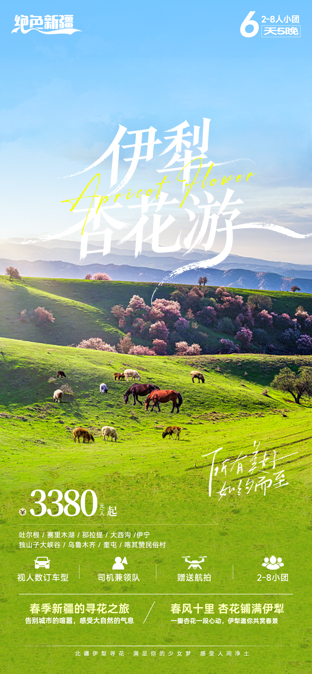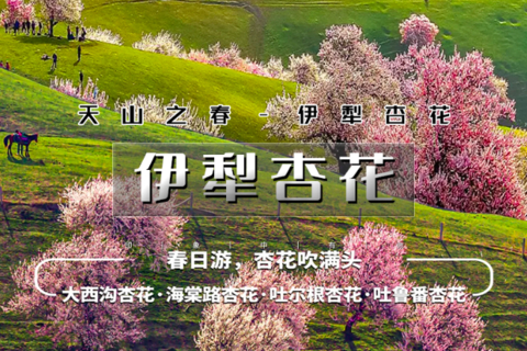 【花期说明】伊犁杏花一般在清明前后开放,受气温及天气变化影响较大,每年花期不固定,无法确保每年最佳花期,不同海拔高度不同地方花开时间都不一样,我司会根据花开情况,灵活调整拍摄行程,最大限度进行摄影创作,花期短暂,请平常心看待,届时请配合领队工作,敬请谅解!