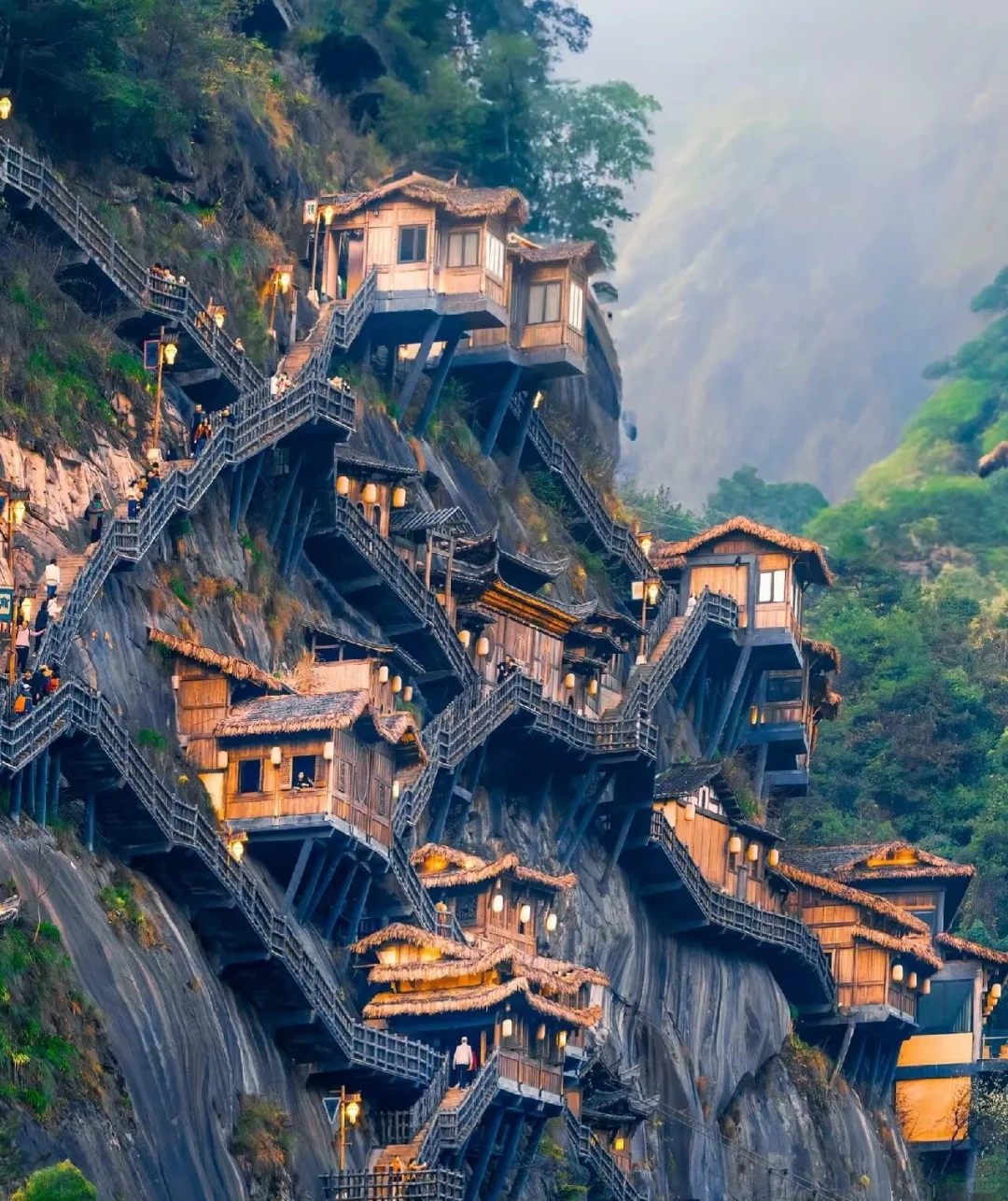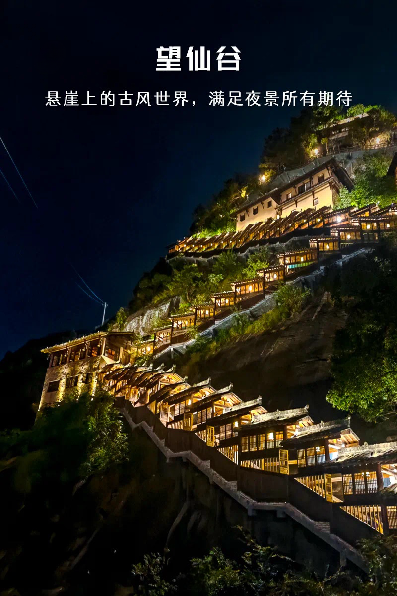 望仙谷源于东汉,始于三国,辖93平方千米。望仙谷以山、水、谷、村、寺、林、田为资源本底,有峡谷漂流、栈道探险、岩铺民俗、天心禅寺、南山桃源、三叠水、胡氏宗祠等众多景点。悬空民宿,传说上古大洪水,白鹤衔来野果解救被围困于崖上的村民而得名“白鹤崖”。东汉胡昭在此羽化成仙后,历代又有众多道家方士慕名而来,在崖上结庐修行。白鹤崖垂直高度有110多米,为复原旧时盛况,白鹤崖上建有12间悬空玻璃客房、悬崖图书馆、悬崖餐厅和高空观景台,可俯瞰整座山谷,远眺灵山龙脊。