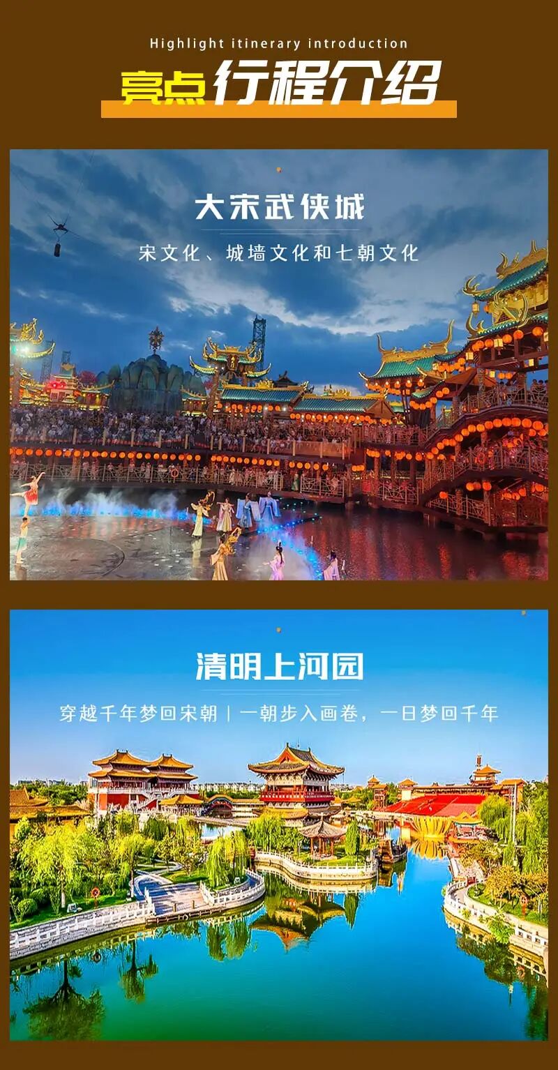 2)门票:清明上河园门票120元,《东京梦华》演出票需提前自行预约第一场,开封府门票65元(团体59元),大宋武侠城门票100元(团体95元),吴桥杂技大世界门票120元(团体100元);以上门票价格供参考,以景区实际规定为准。