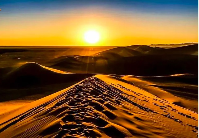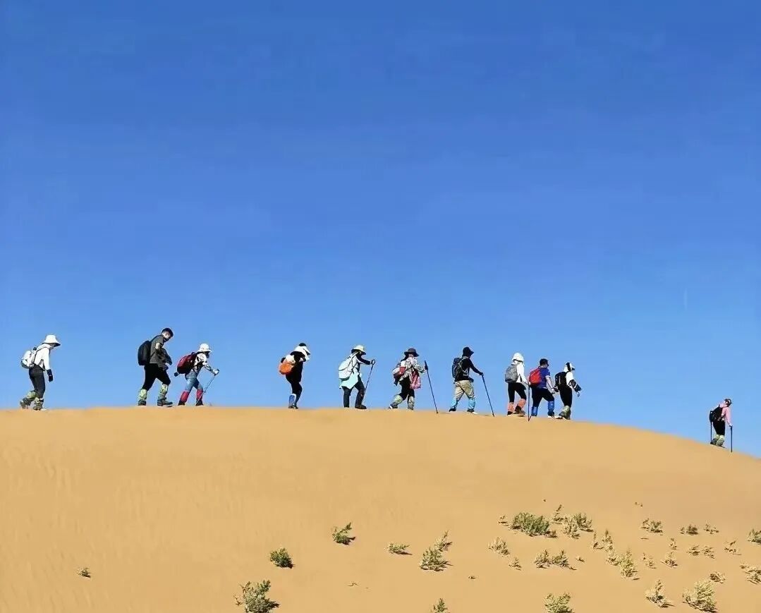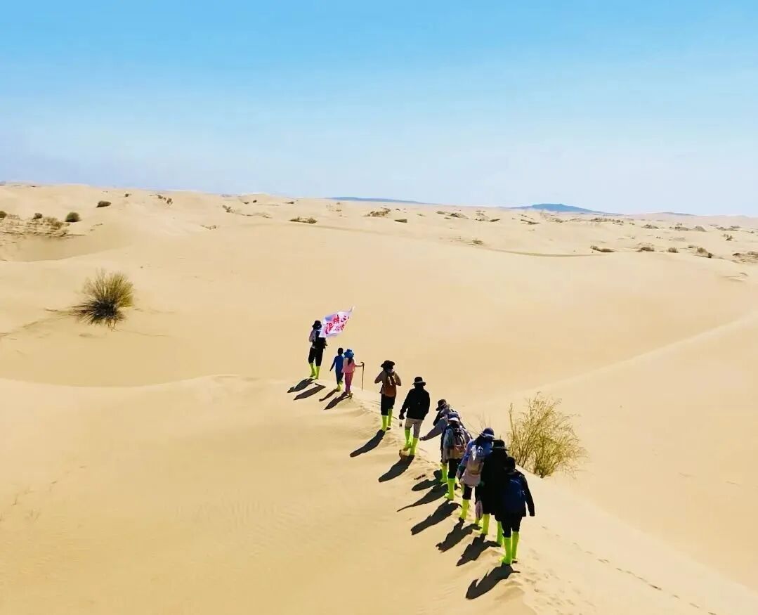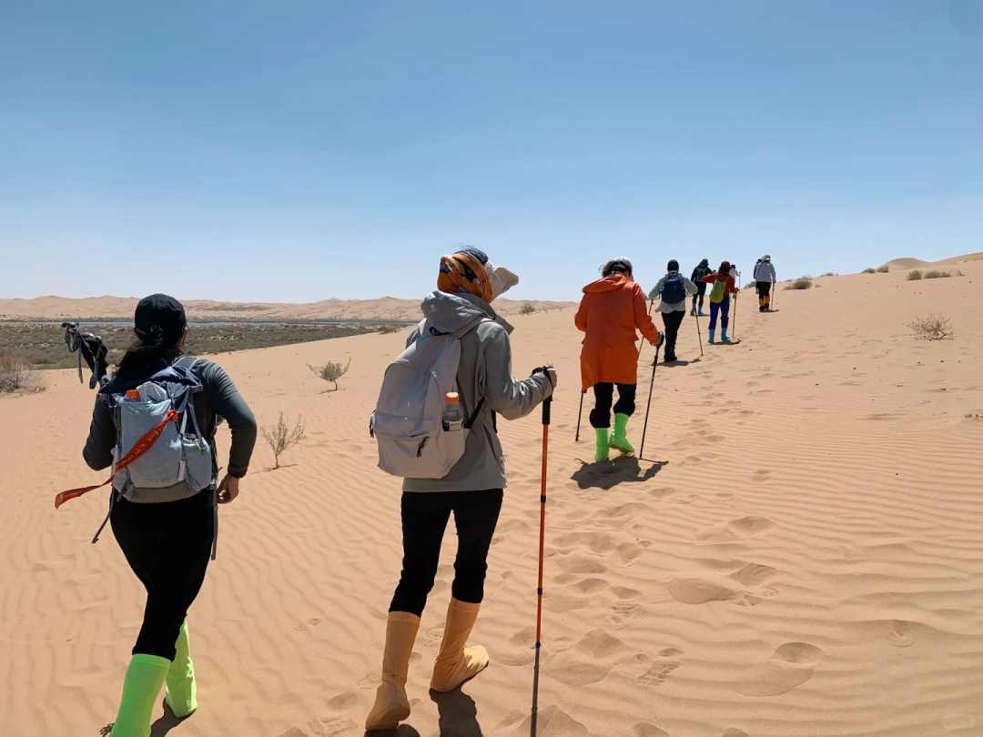 - 愿意看沙漠日出的自愿早起,欣赏沙漠日出享受难得美妙;大家早起后早餐,之后拔营,继续新的一天的徒步之旅。 - 在沙山中行走要求队员有更好毅力与耐力,跟紧领队的步伐。途中需翻越几座比较高沙山,跨越穿沙公路,中途在沙漠中的绿洲边休息、路餐(注:每人需准备2-3升水,午餐1份)。 - 下午我们走出沙漠,适时集合集体乘坐大巴前往呼市住宿。 安排完大家住宿之后,大家自由结伴寻美食、喝小酒,在酒店里好好洗个澡吧,洗去这两天的灰尘和疲惫。