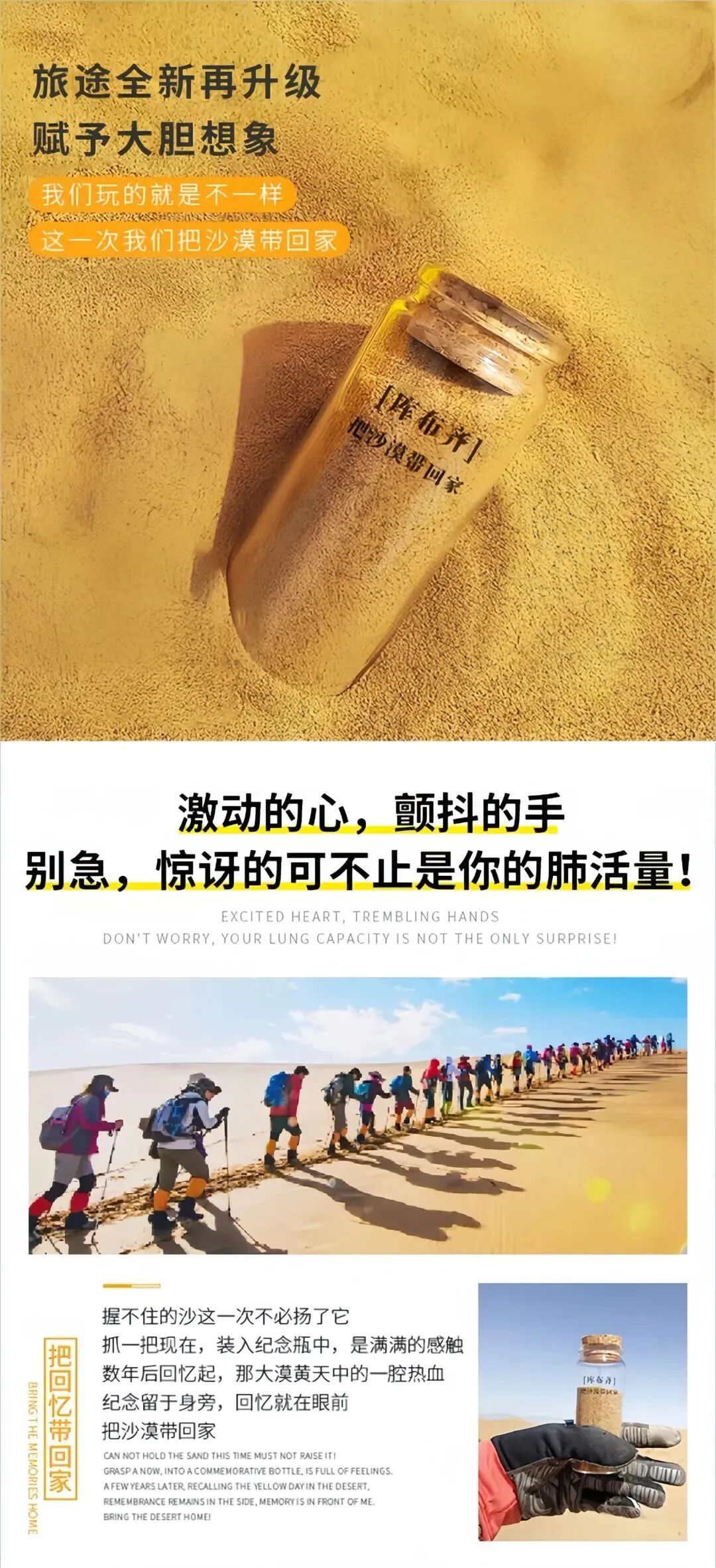 沙漠里给装一瓶沙不管是第几次进沙漠,总是能被它的神秘力量折服,好像世界一下子安静了下来,也好像身上再也没了束缚,但自由却总在以某种方式等着你去发现我想让你们也能感受到这份自由,在陌生的城市有个熟悉的我,有空来沙漠看看吧