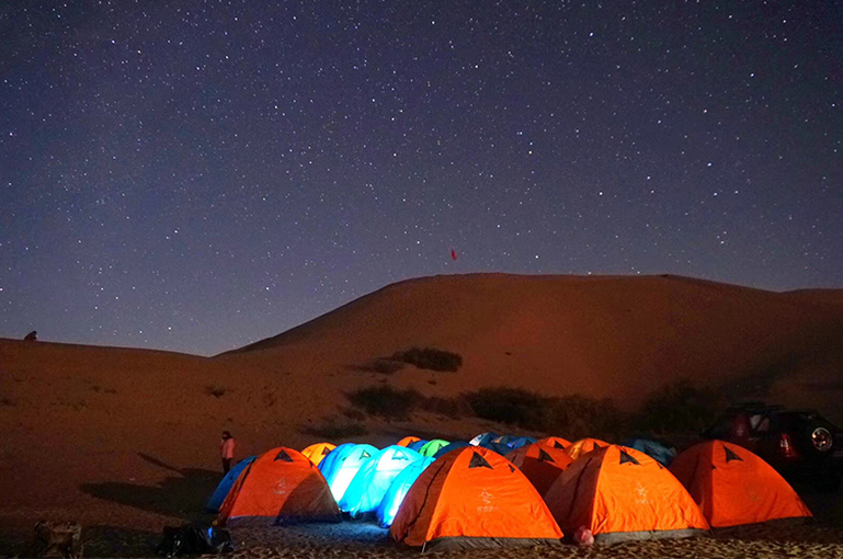 上午|到达营地后,领队开始给大家讲如何搭建帐篷,然后我们一起搭建帐篷休息。之后大家可以吃个午餐,帐篷里休息一下,等领队通知开始徒步,不想徒步的朋友可以在营地自费玩一些沙滩摩托很好玩的。 - 晚上这里有物资补充,晚上一起吃团餐管饱吃,篝火唱歌。夜深了,漫天银河繁星,坐在帐篷里尽尽的发呆吧,然后慢慢入眠,真正体验沙漠露营的奇妙感觉!