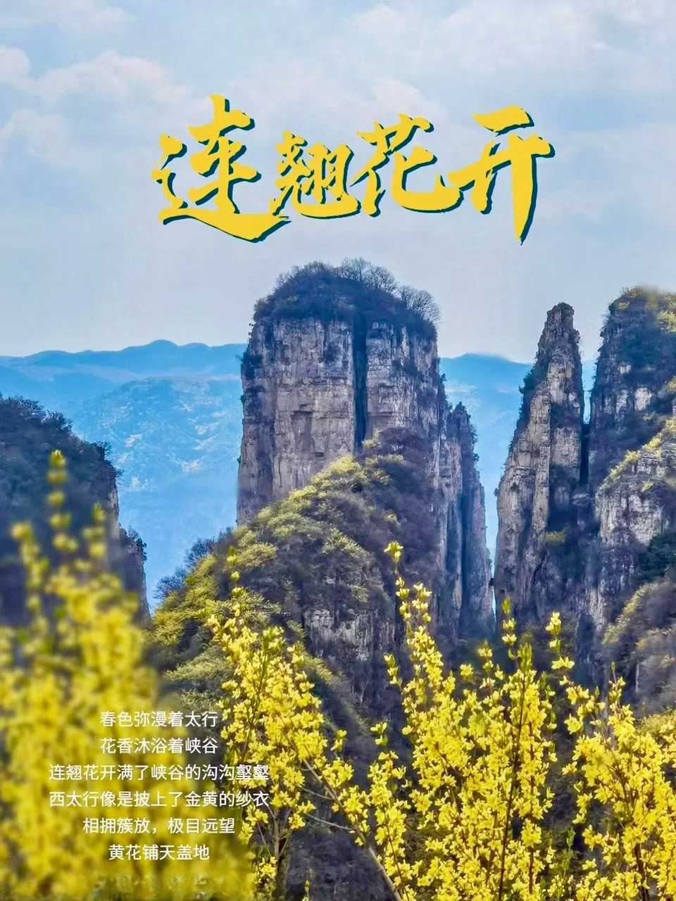 #西太行春色弥漫着太行花香沐浴着峡谷,连翘花开满了峡谷的沟沟壑壑,西太行像是披上了金黄的纱衣 相拥簇放,极目远望 黄花铺天盖地 与错落有致的山脉交相辉映 构成一幅美丽的山水画卷 静待你来 2025一起徒步秘境西太行,看连翘花开醉太行!