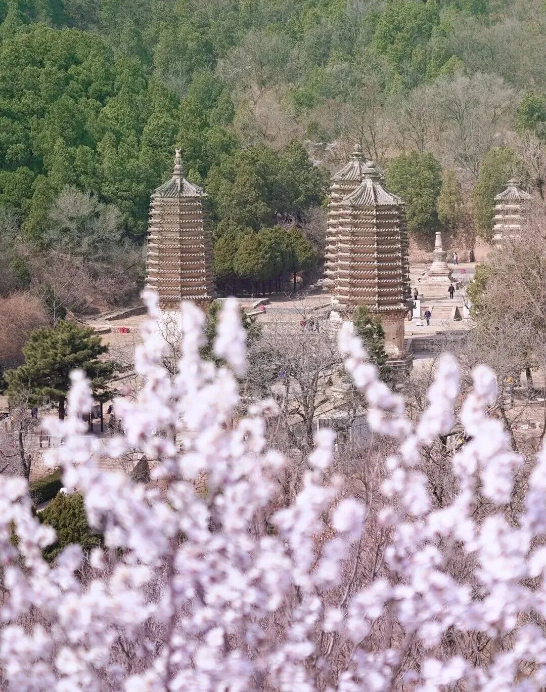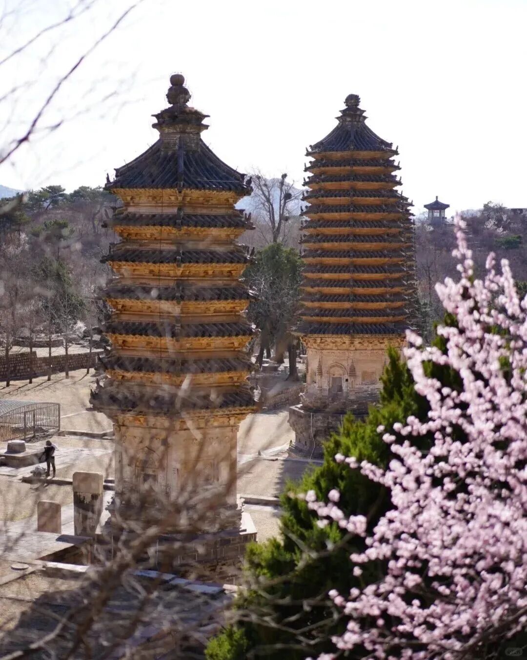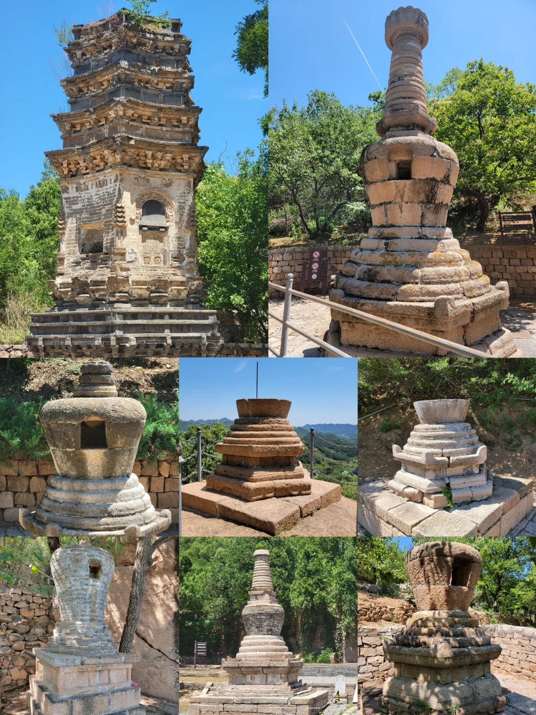 一进入景区,便能看到令人震撼的七塔同框盛景。这里曾是法华寺,独特的殿与塔结合布局,可惜在抗战时期被日军炸毁,如今仅留存 5 座金代宝塔!整个景区内还有18座高僧塔。