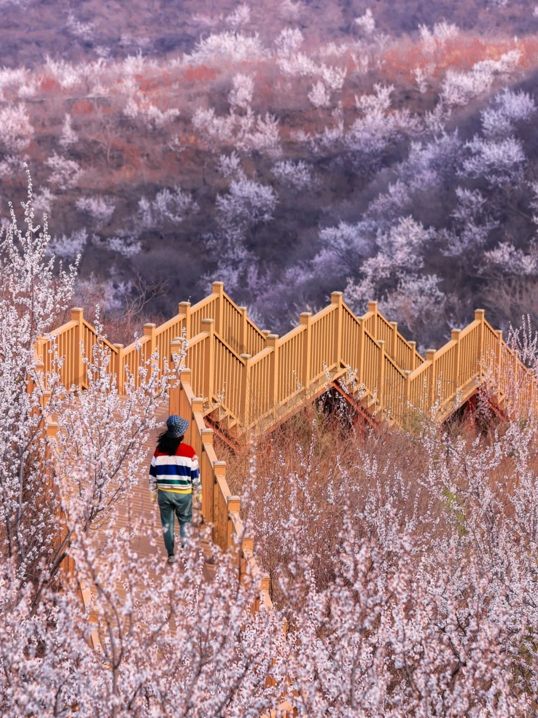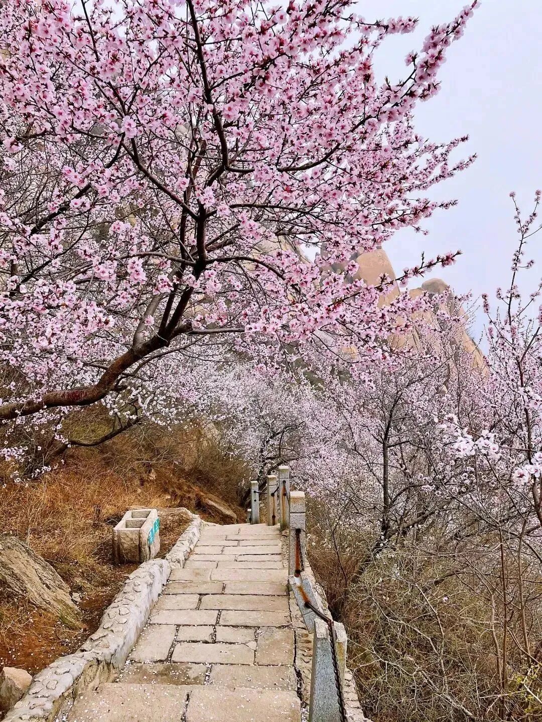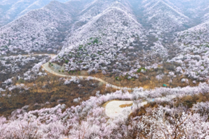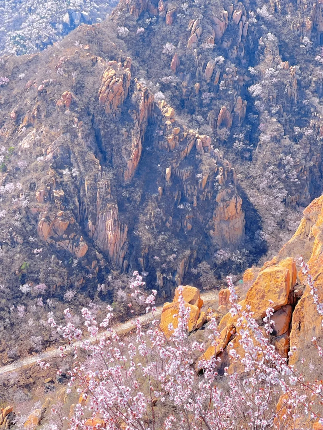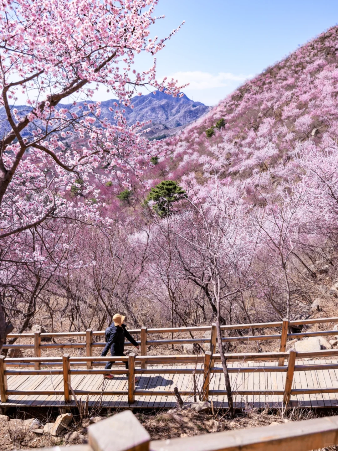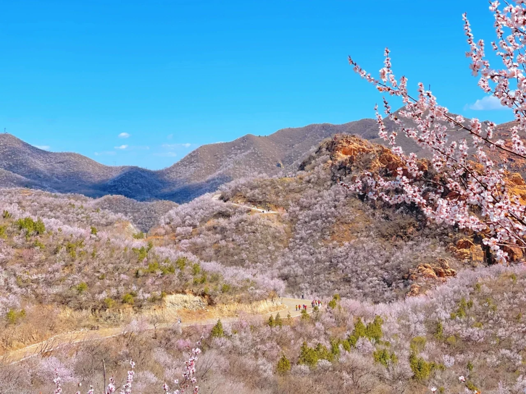 每到春天就会变成粉红色的海洋,大多数植物还没有来得及抽芽,漫山遍野的桃花铺满山坡,不夹杂着一点其它颜色。白虎涧的桃花全是野生的,依山而上蜿蜒起伏,开得肆意而绚烂,与陡峭的山峰、湛蓝的蓝天构成了北京郊区最美的桃林春景画卷。