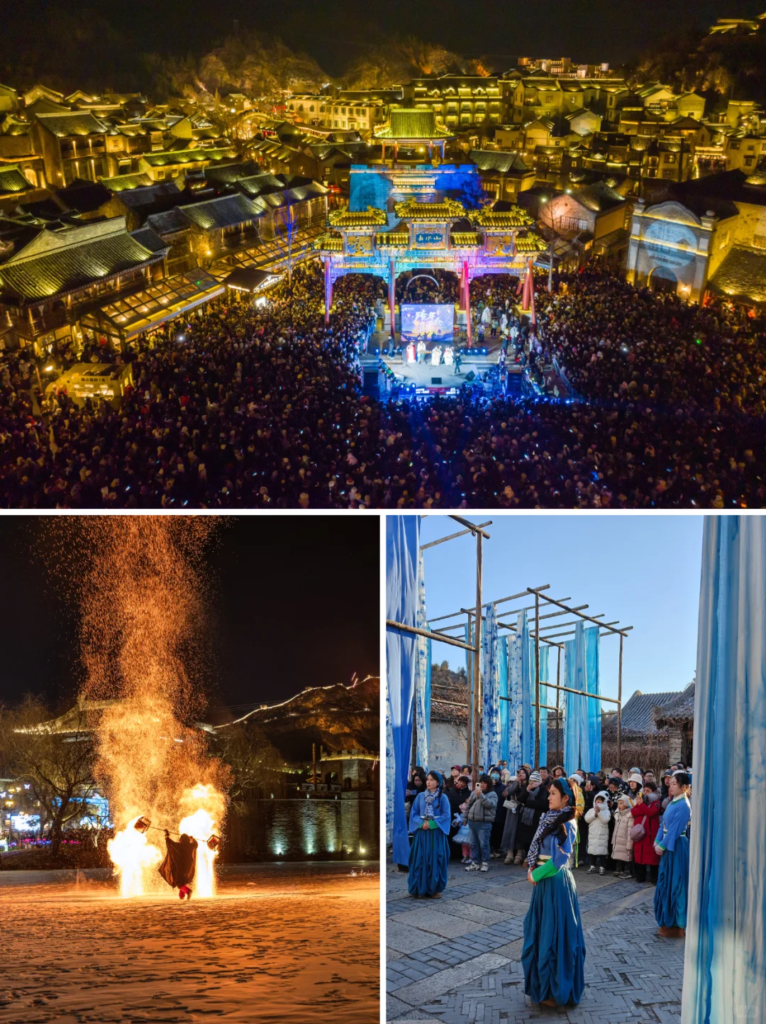 等到夜幕降临,古北水镇如同戴上了金色的薄纱,整个镇子都亮起了金色的光,我们可以到牌楼附近的大戏台看看镇子上免费的表演,也可以尝尝戏台前的小吃摊,这时你就会有种穿越的感觉,坐着宽板凳,听着戏、相声,我们仿佛回到了古代。