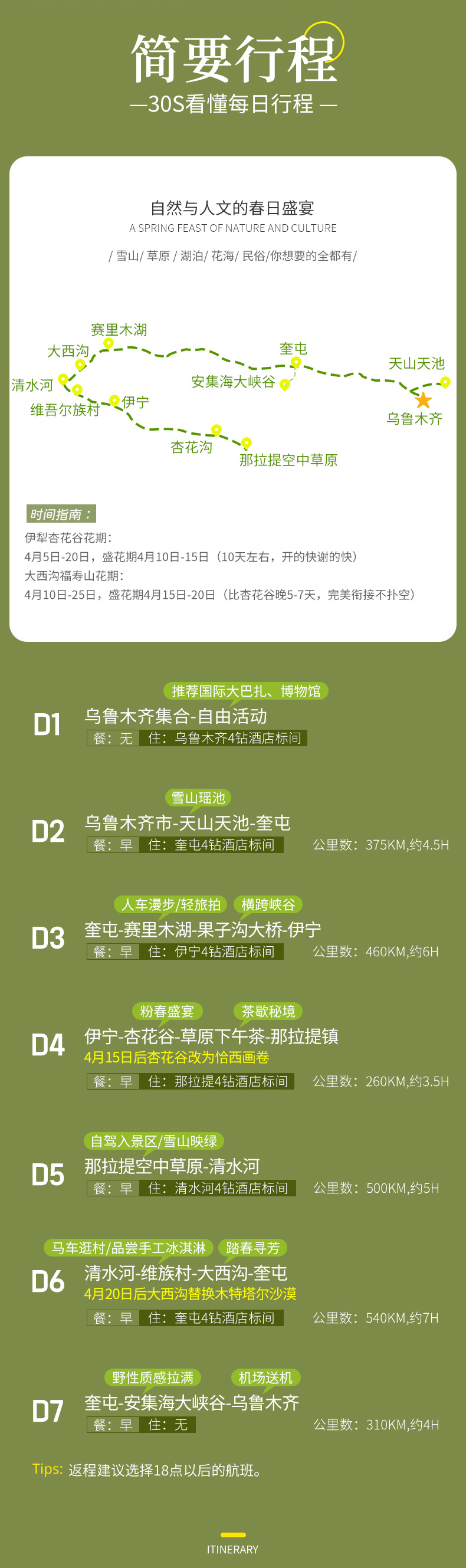 4、门票:天山天池门票+区间车,赛里木湖自驾票,杏花谷门票(花期过后改为恰西门票),大西沟福寿山门票(花期过后改为木特塔尔沙漠景区门票),那拉提自驾票;