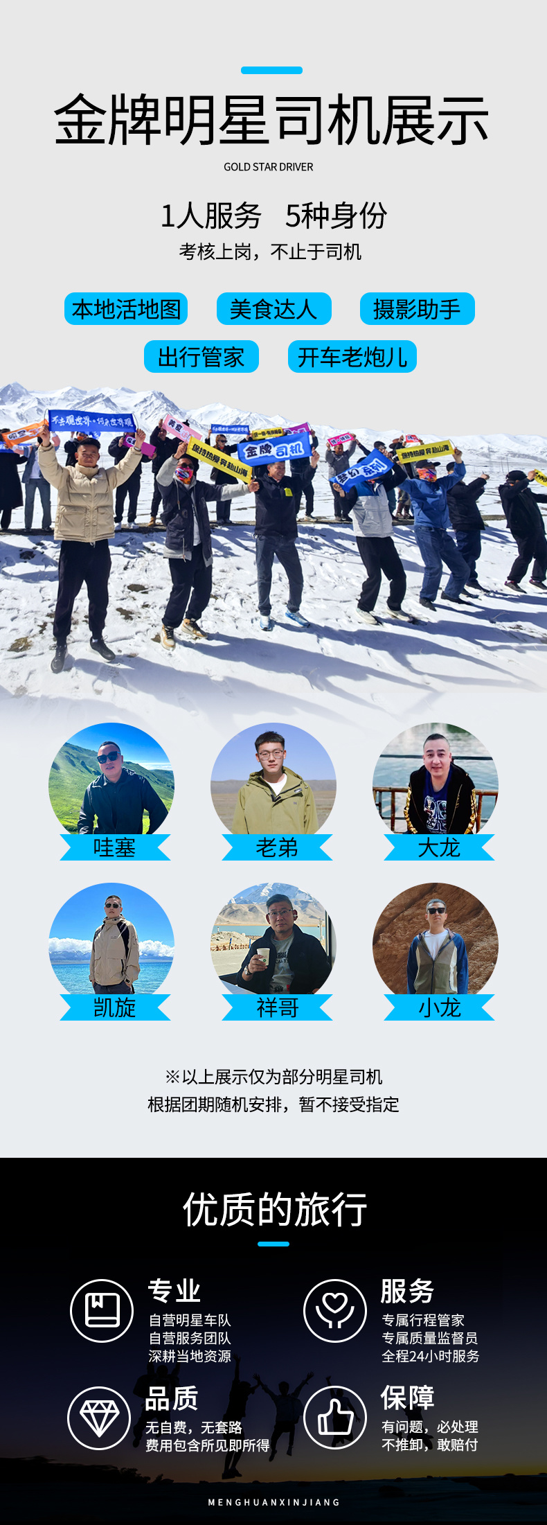 5、领队:司机兼管家,司机帮助大家购买门票,给团友游玩建议,无法全程陪同进入景区和提供专业讲解等服务,敬请谅解。