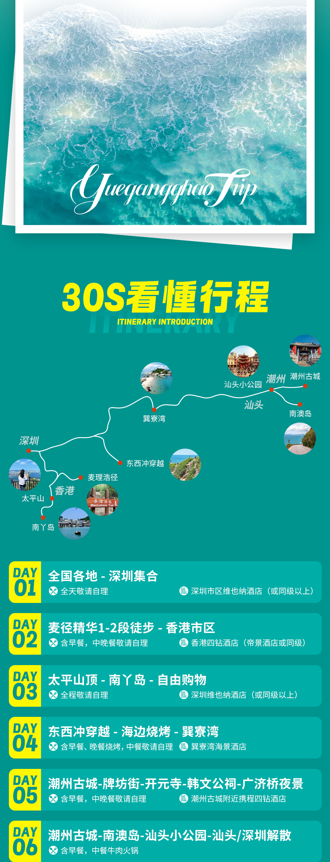 4)全程5晚住宿:深圳市区维也纳酒店二晚,香港市区四钻酒店一晚,惠州巽寮湾海景酒店一晚,潮汕地区携程四钻酒店一晚;