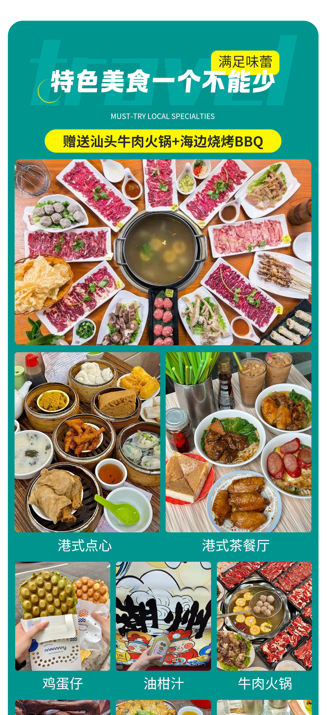 5)餐食:行程五天早餐,巽寮湾海边烧烤BBQ,潮汕当地老字号牛肉火锅;