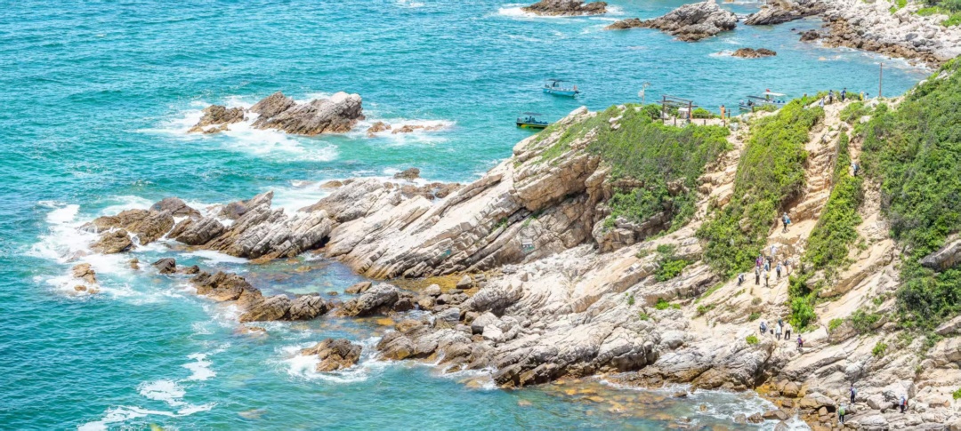下午沿海岸线攀越山崖、踏过礁石,向西冲挺进,途中有红旗标志打卡点,到达天文台网红悬崖栈道上,在高点俯瞰这开阔的海岸线。随后跟着领队下山到达【西涌沙滩】结束这段徒步,后集体乘车前巽寮湾入住海景酒店。