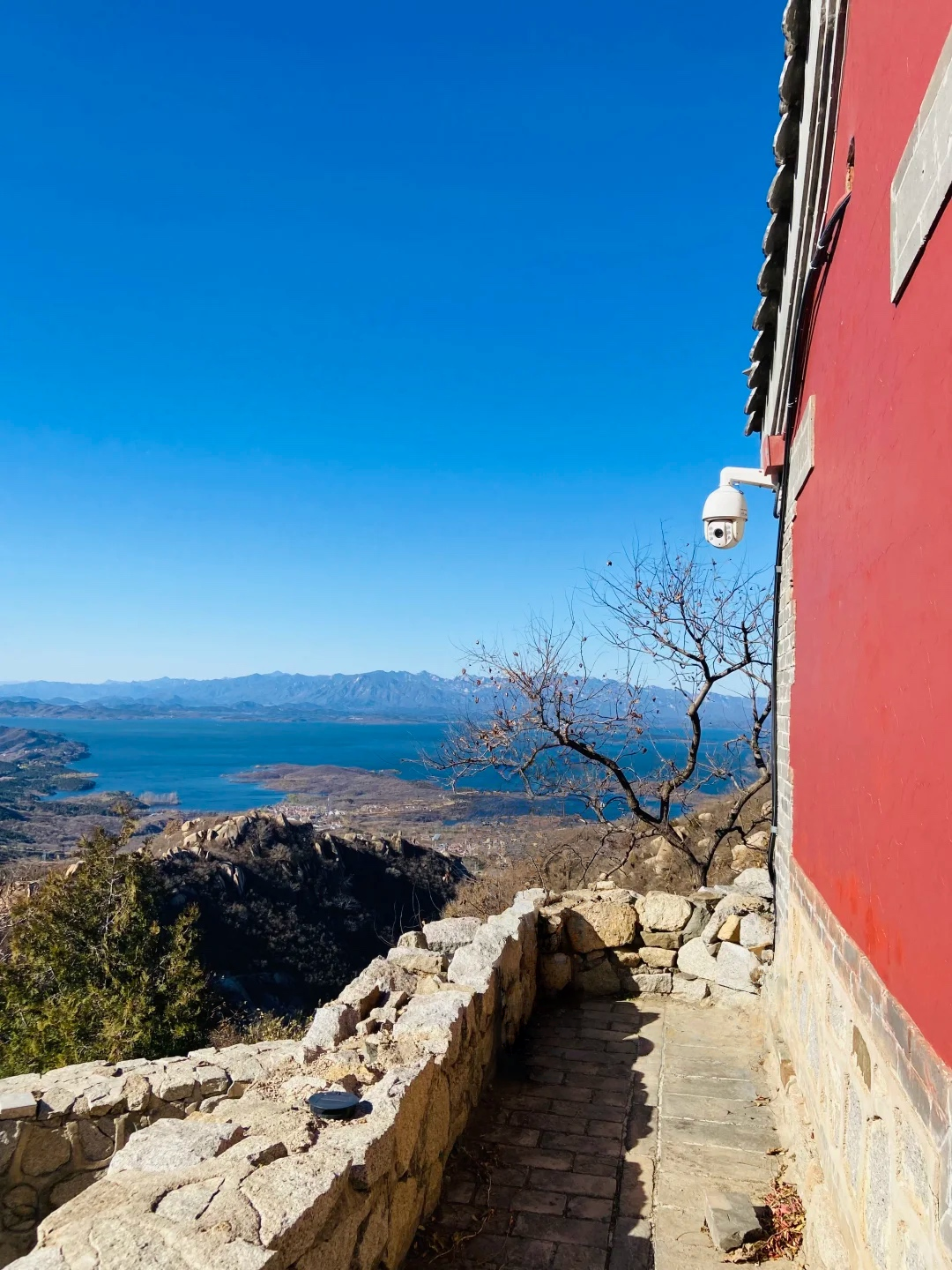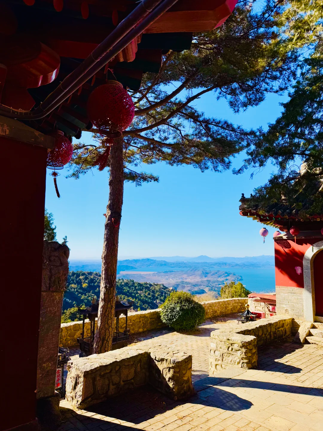 寺内临崖修建有一座茶室既能远望群山环绕的水库