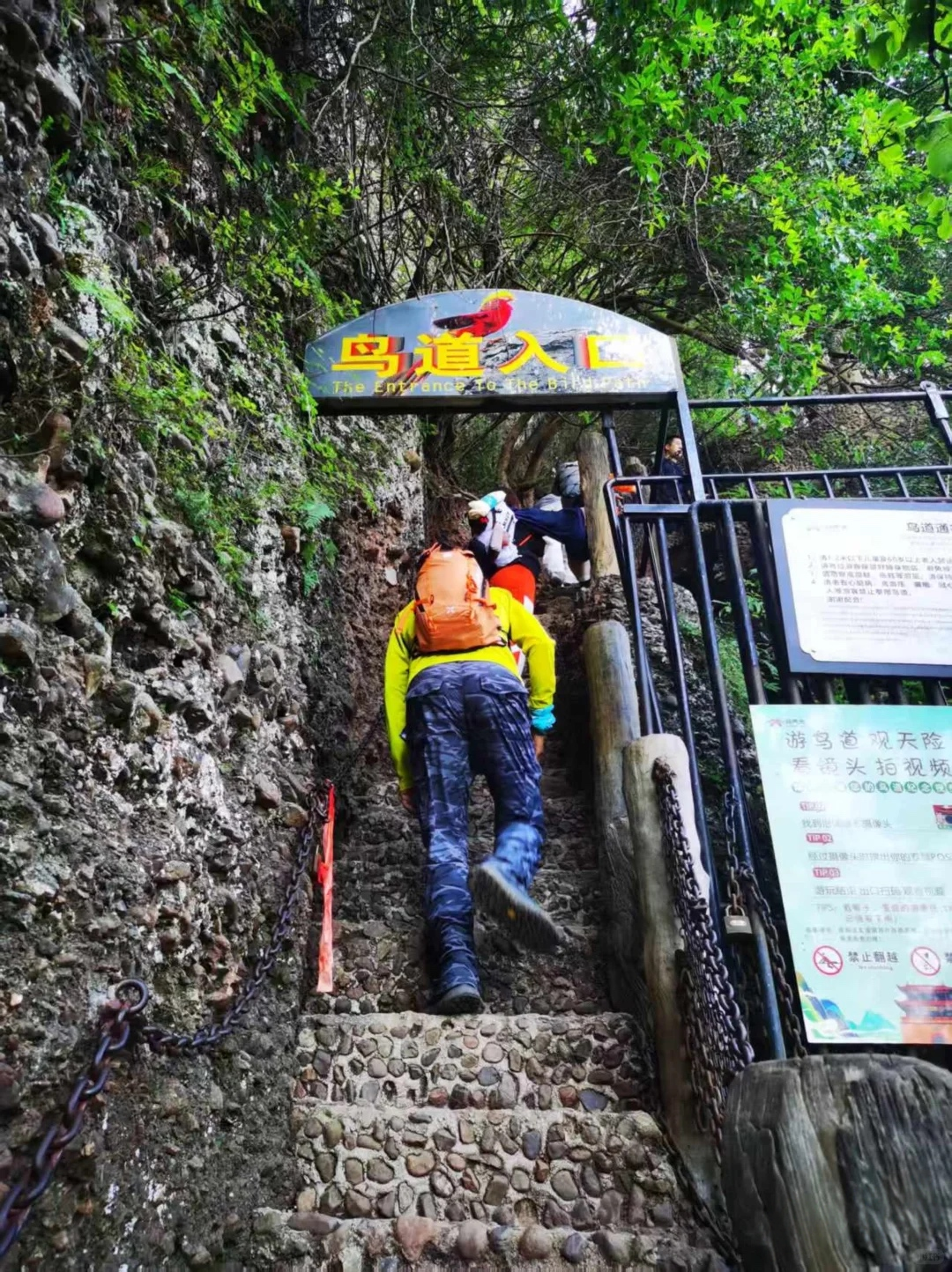 鸟道是一条集探险、攀援、观光为一体的徒步游道。全长900米,其中步游道400米,垂直高差达110余米,路面宽约30厘米。鸟道名称取自李白《蜀道难》中“西当太白有鸟道,可以横绝峨眉巅”的诗意,它曾经是采药人通行的便道,鸟道设有铁链护栏,游客无需佩戴安全帽和安全带,便可自由攀登。