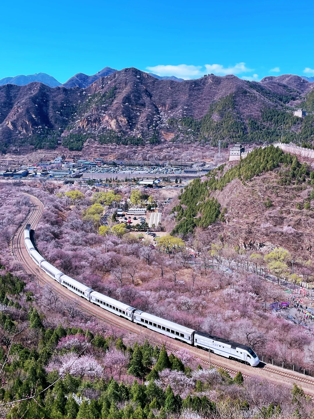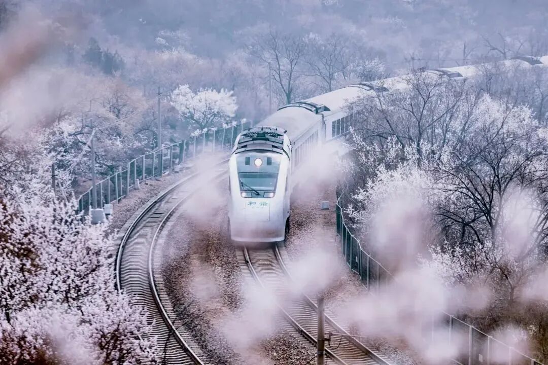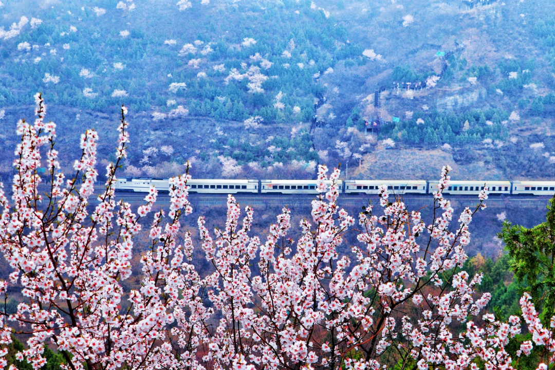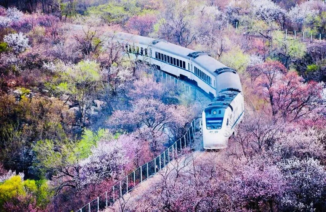 这就是被称作开往春天的列车的S2线,一路上你能看到漫山遍野的山桃山杏花,沿着京张铁路,感受着人字形的曲折迂回,灵魂在这短暂的旅途中会得到进一步升华!这趟开往春天的花海列车一定是这个春天最美的邂逅。