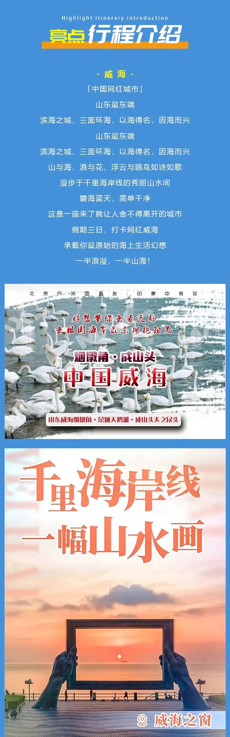 - 早起继续出发前往威海,抵达威海后我们先去酒店办理入住。之后可以结伴品尝威海美食,自由游览威海最美海岸线(可以打卡火炬八街、幸福门、威海之窗等网红景点;还可以游览威海公园、悦海公园、海源公园、海上公园等海岸线公园;傍晚可在小石岛欣赏日落;晚上可以自由前往韩乐坊夜市品尝美食小吃)。