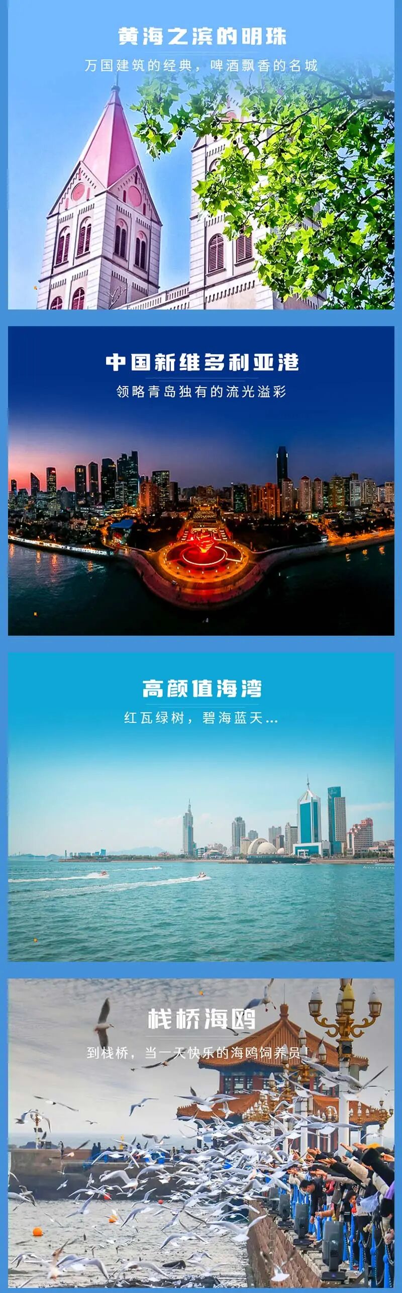 - 午餐后我们适时前往青岛安排入住。之后我们可以结伴游览前往五四广场、奥帆中心。大家沿海岸线徒步赏景拍照,五四广场-奥帆中心夜景非常漂亮,也是青岛地标景点。