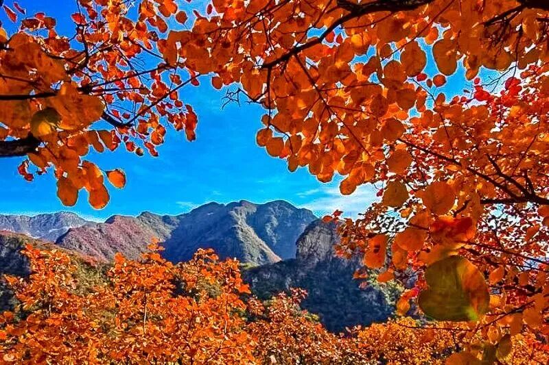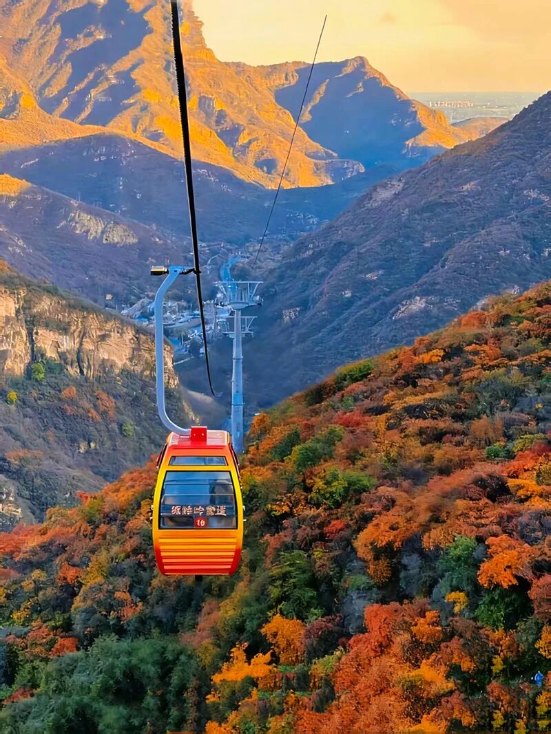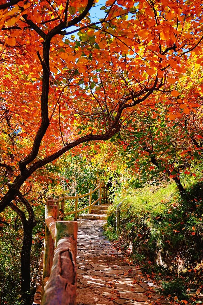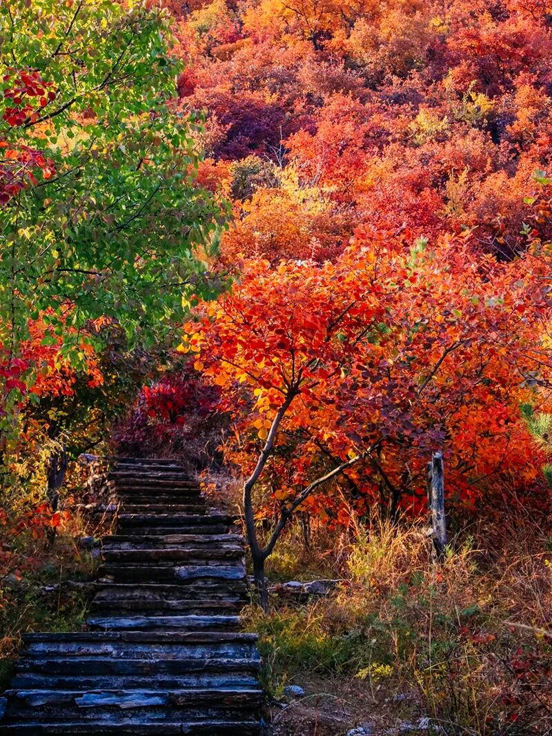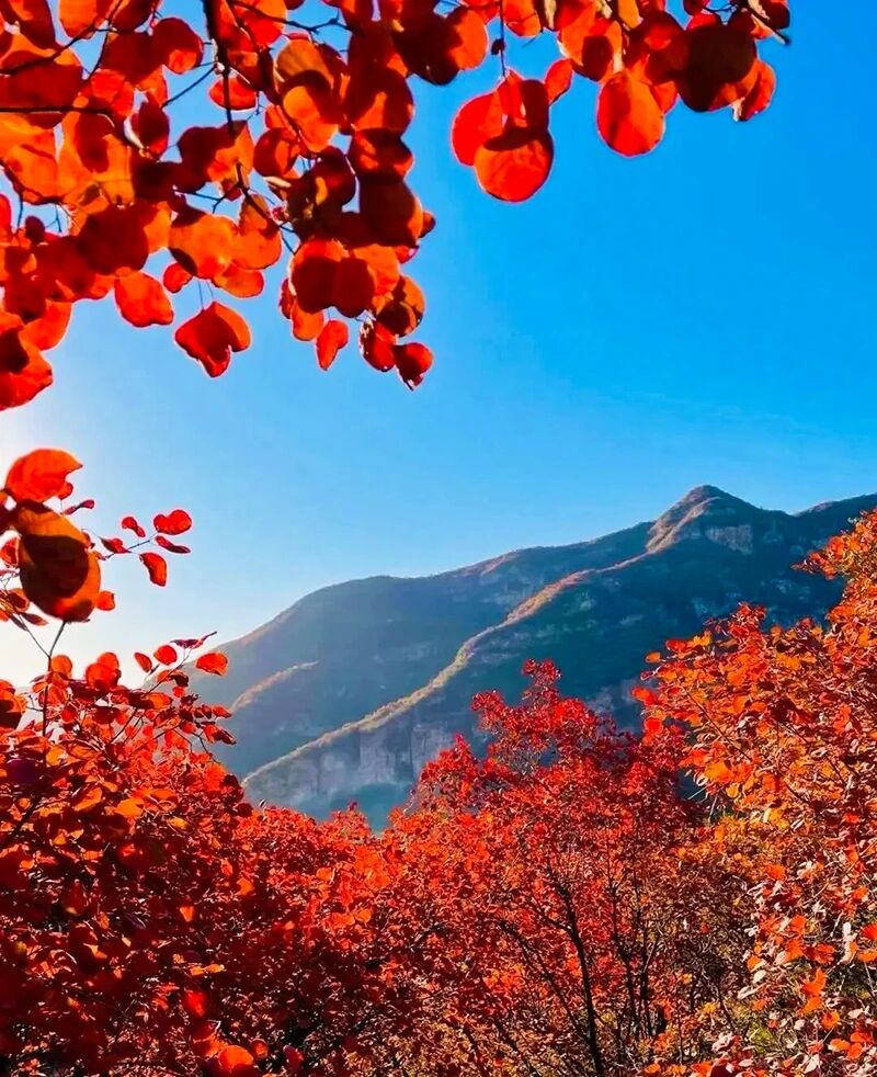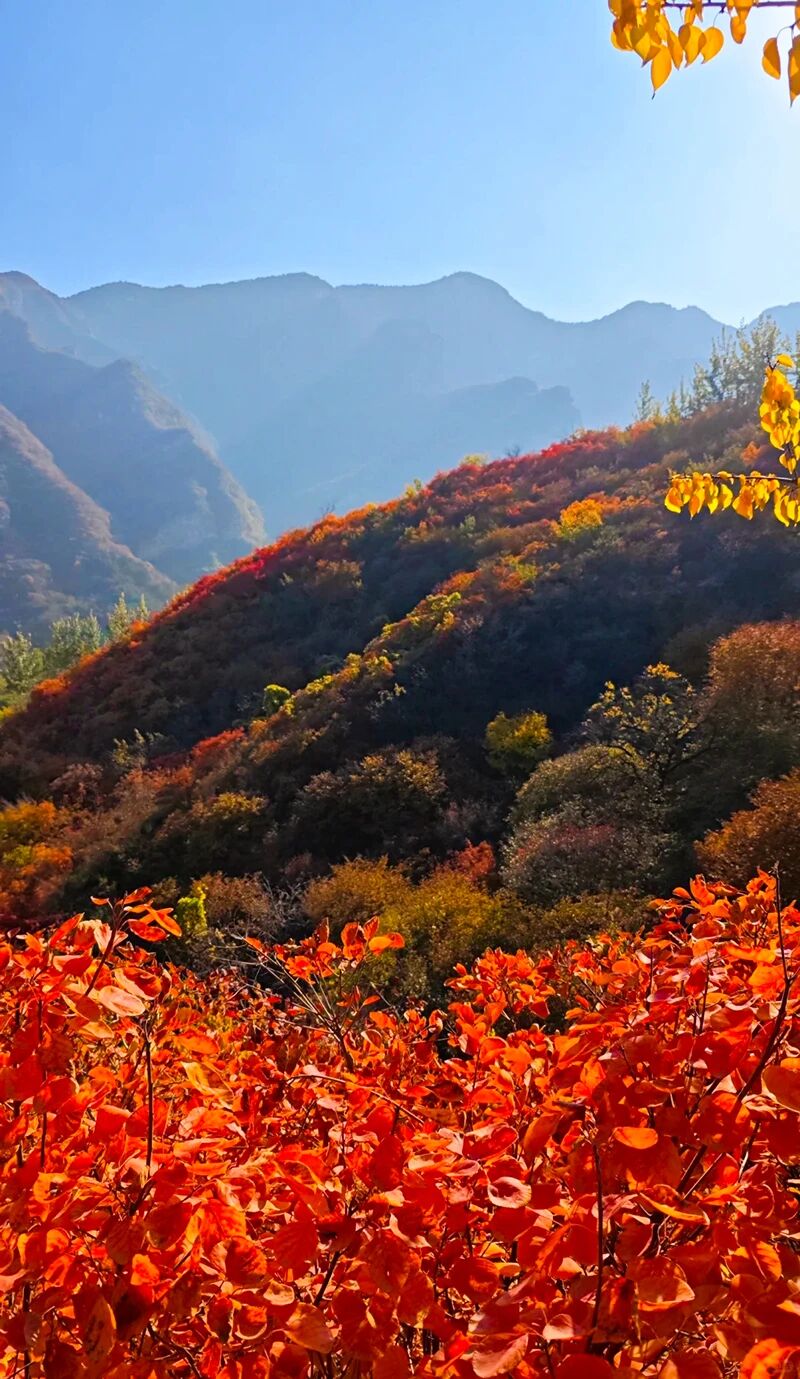 红叶里震撼的莫过于漫山的万叶皆丹,不留一点遗憾的红让你惊叹自然的神奇。当满山黄栌渐渐被秋阳点亮,大块的色彩嵌在莽莽山谷两侧,直令人如痴如醉。
