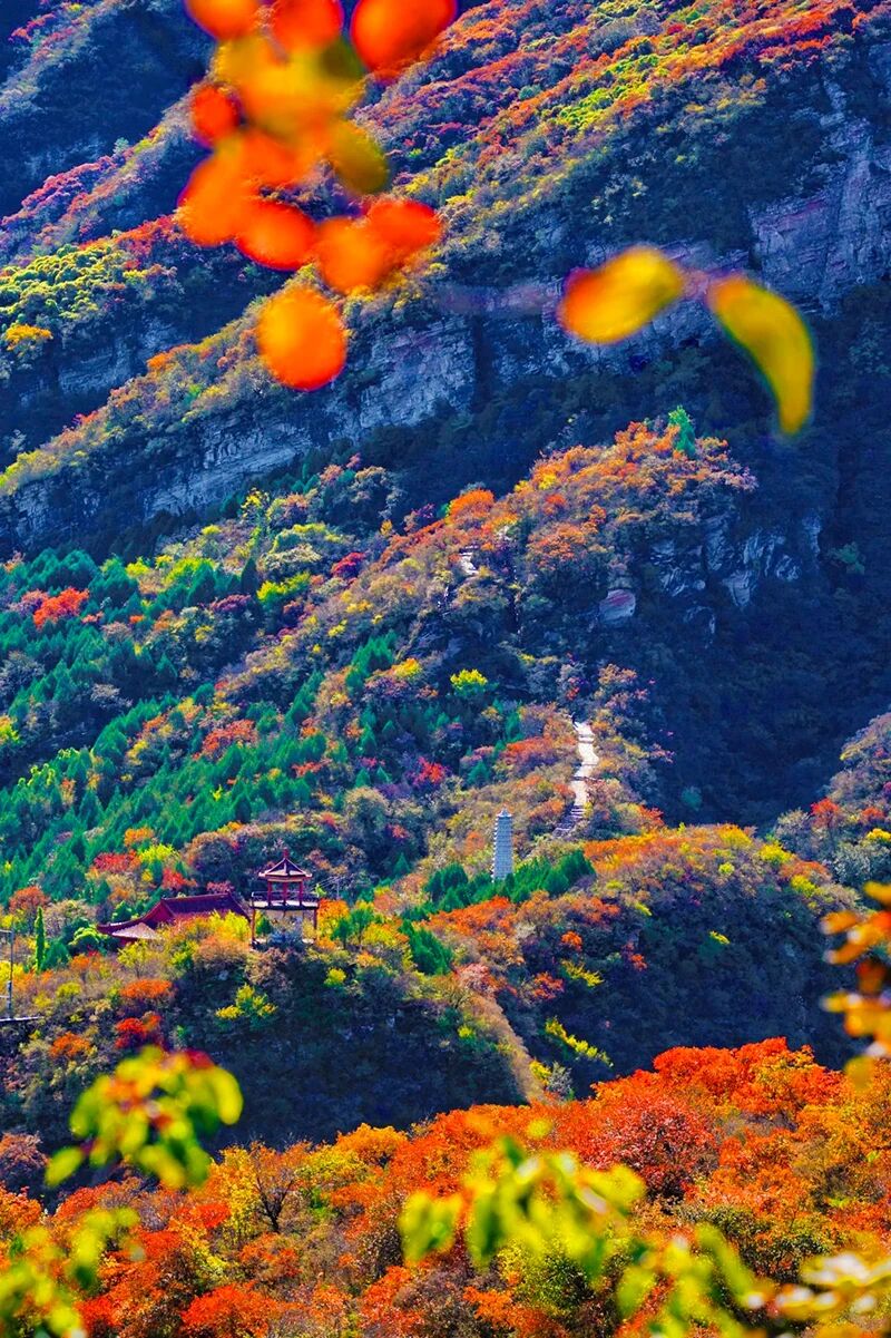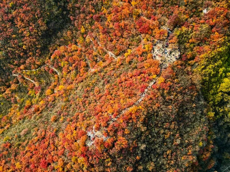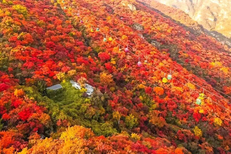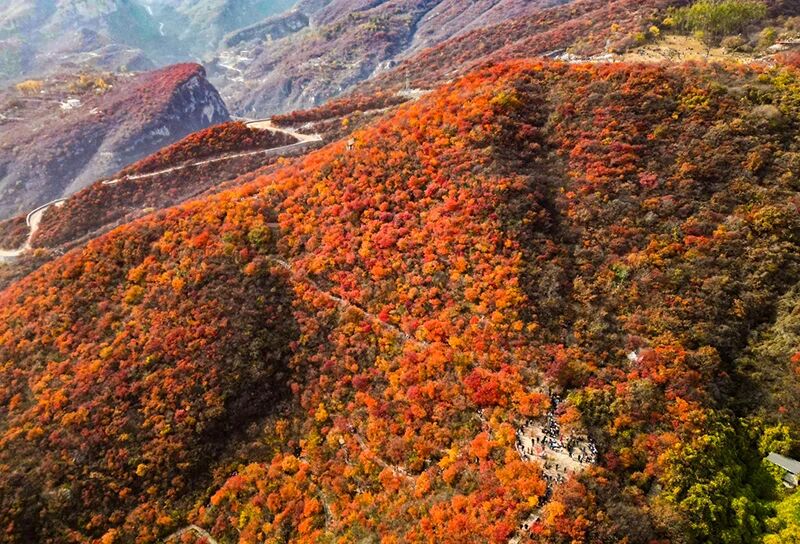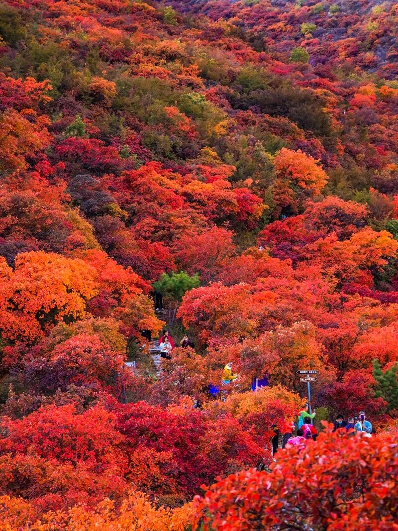红叶密度堪称华北第一的坡峰岭,核心观赏区达两千余亩,每年秋天,二十万株野生黄栌恍若一幅繁茂磅礴的秋景油画。