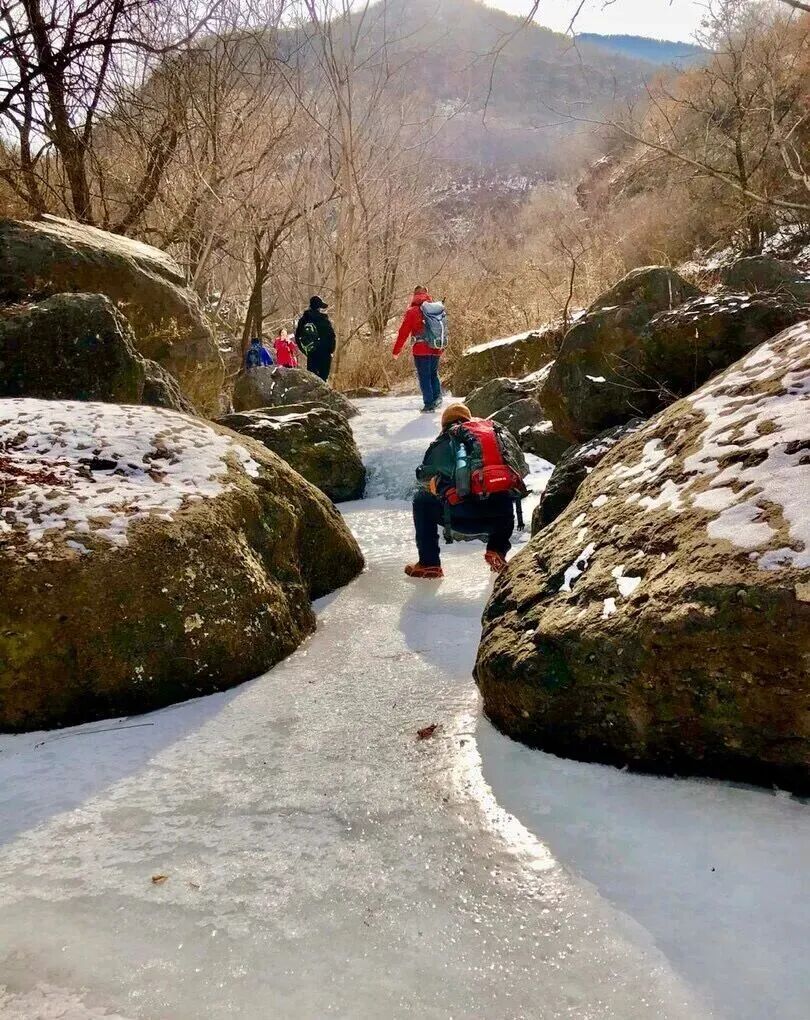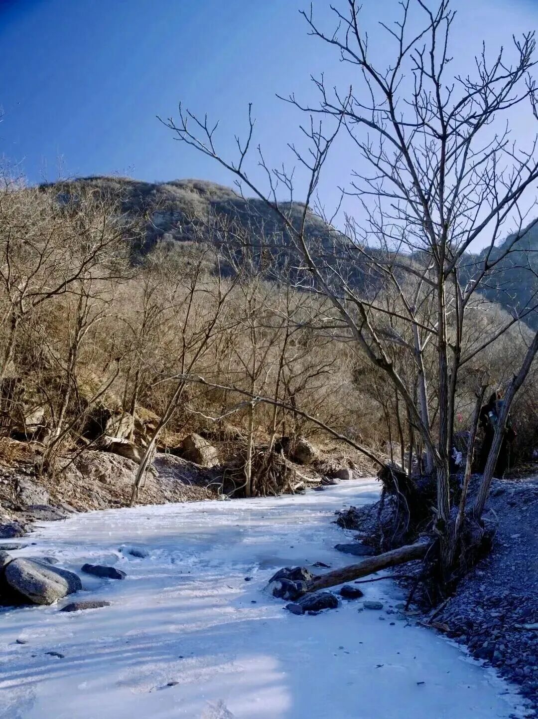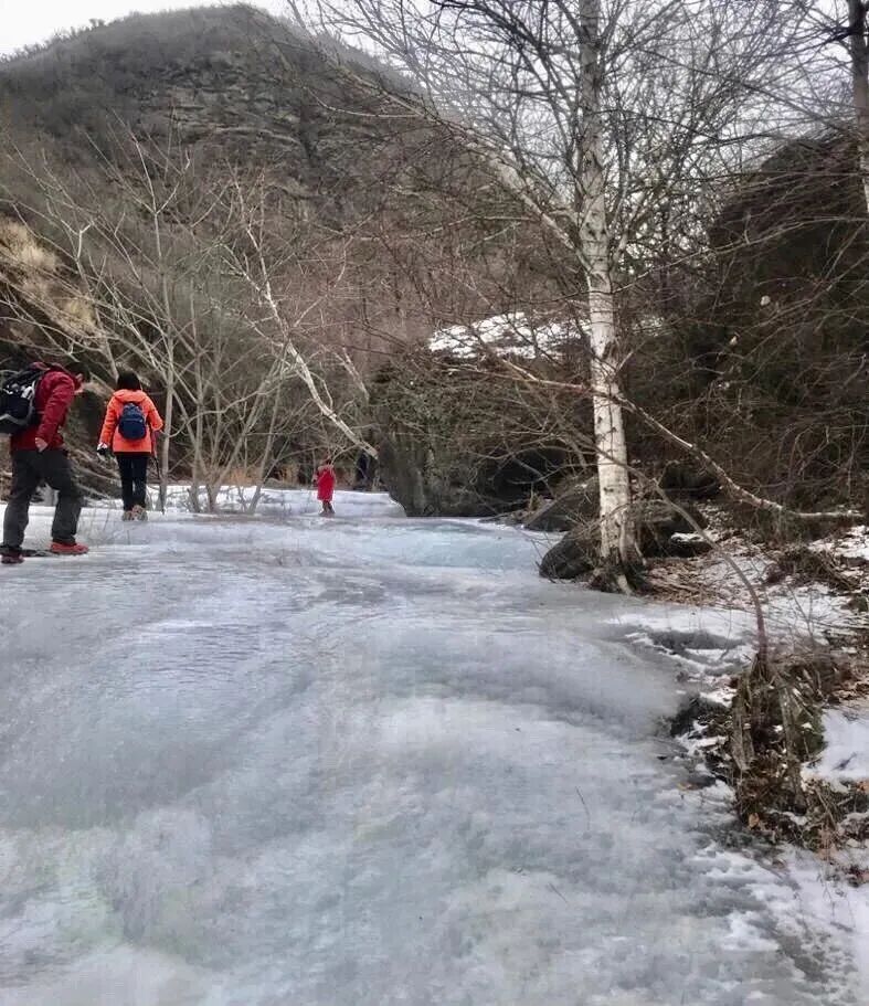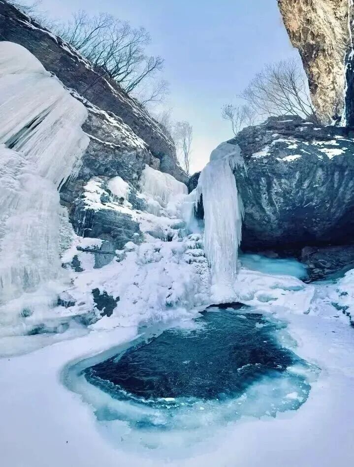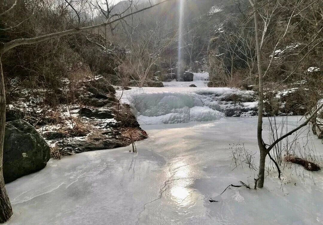 往日流水潺潺的河溪,凝结成洁白的“玉带”在山涧舞动。悬挂在崖壁之上,山谷之下,一派琼妆玉砌,凝固成冰瀑,冰床,冰梯,冰花,冰凌,闪着银光,似乎把人带进了瑶池仙境。这酷似晶莹剔透的童话世界,是老天赐给我们的冬日最美好的礼物。