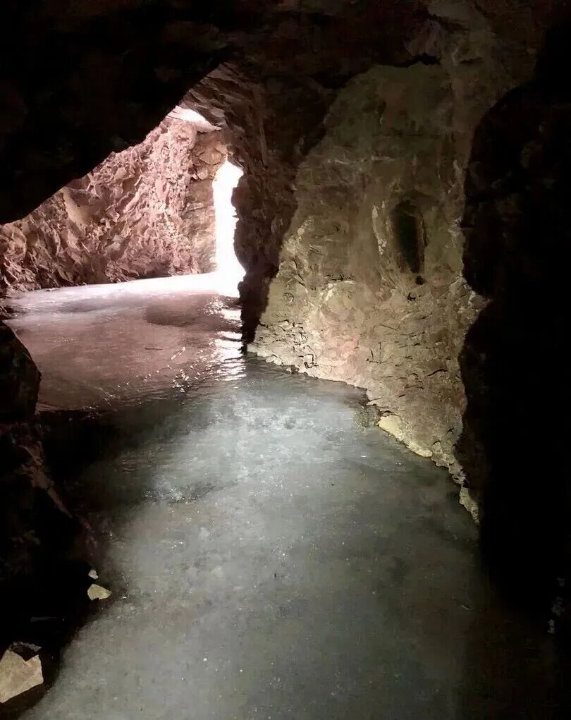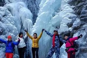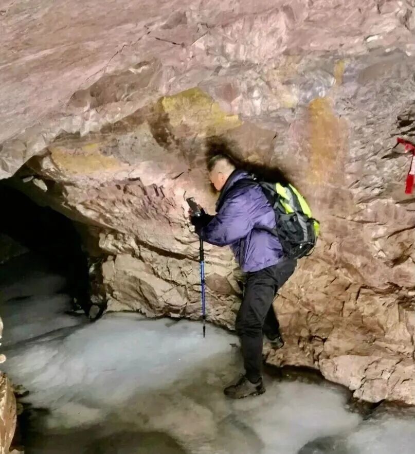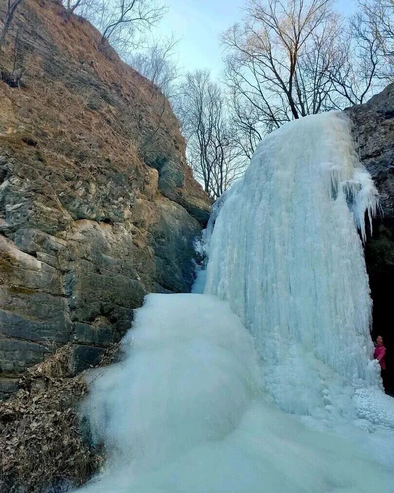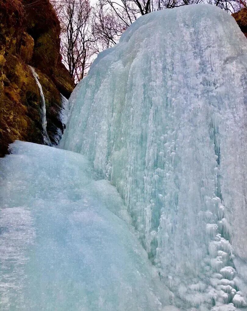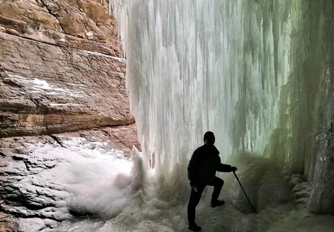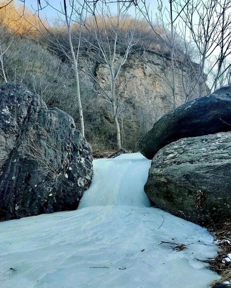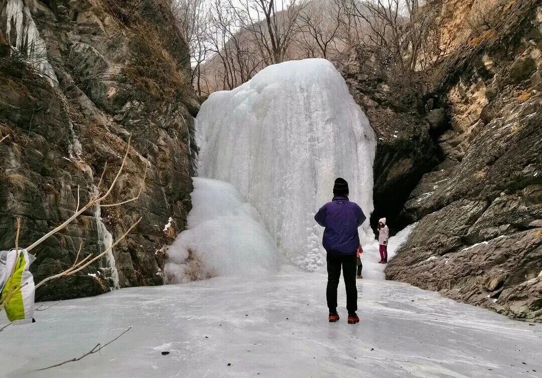 山谷深处,一道高10米、宽5米的冰面飘于崖边,像壮美的瀑布一样,冰瀑右下边的冰面已经被“撕破”,露出后面的凹型空洞,宛若花果山上的水帘洞。洞口的冰瀑珠帘玉垂如在开半帘的厚重帏幕帘,让洞里充满神秘感。近距离接触冰瀑,由上而下的流水冻结了各种姿态的冰瀑,非常震撼,两边黝黑的岩石衬托着冰瀑更加洁白迷人。