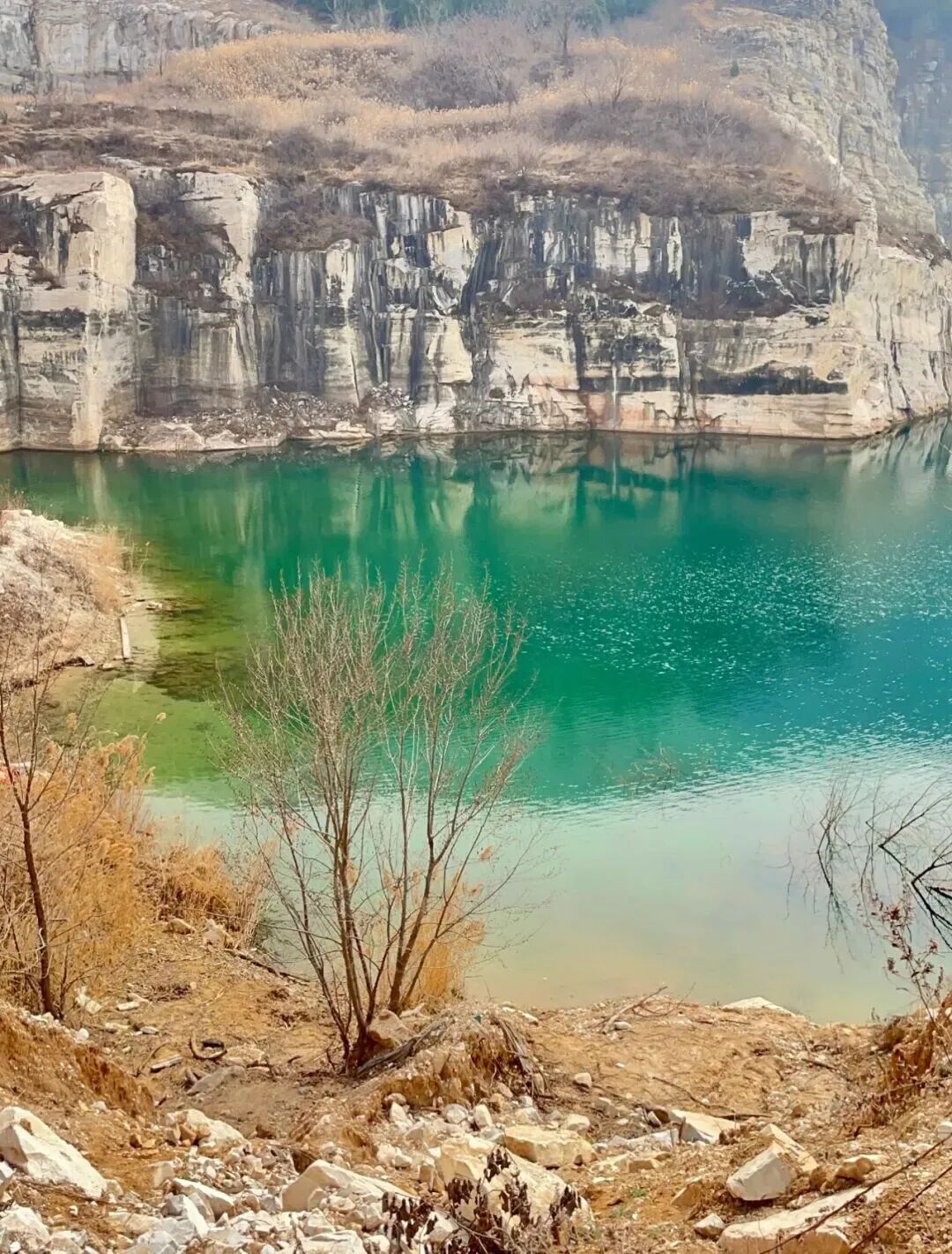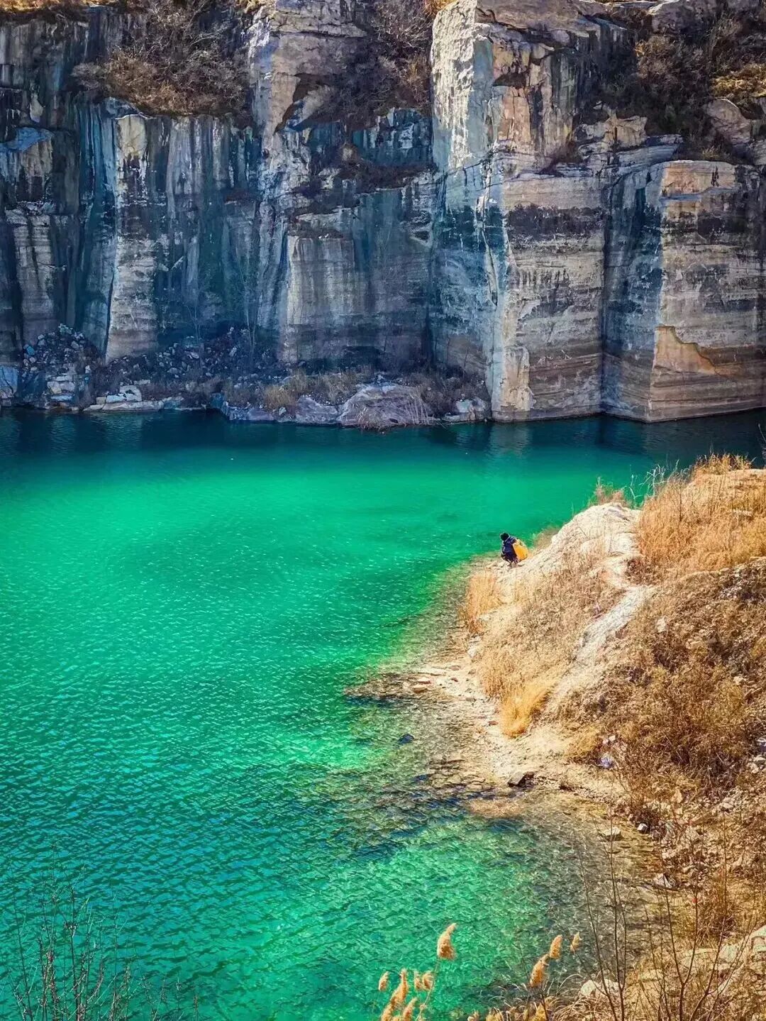 房山区大石窝镇,是北京乃至全国最著名的汉白玉产地之一,在高庄村的村口有个巨大影壁,上面刻着“汉白玉的故乡”这几个大字,这曾经是村子多年以来的荣耀的象征,而今我们所看到得翡翠湖便是曾经的矿坑!有人说它像极了青海翡翠湖,倘若站在山腰处远望时,它好像一块翠绿色的水晶石。在不同的角度,拍摄出来的水便呈现出不同的颜色,到真是有几分小九寨的韵味了!它就是,近年京郊的 网红打卡地“翡翠湖”。