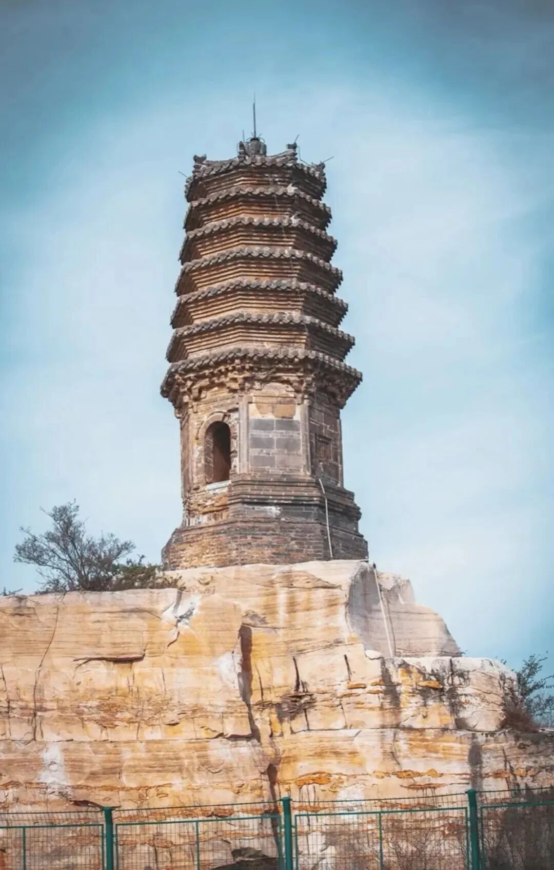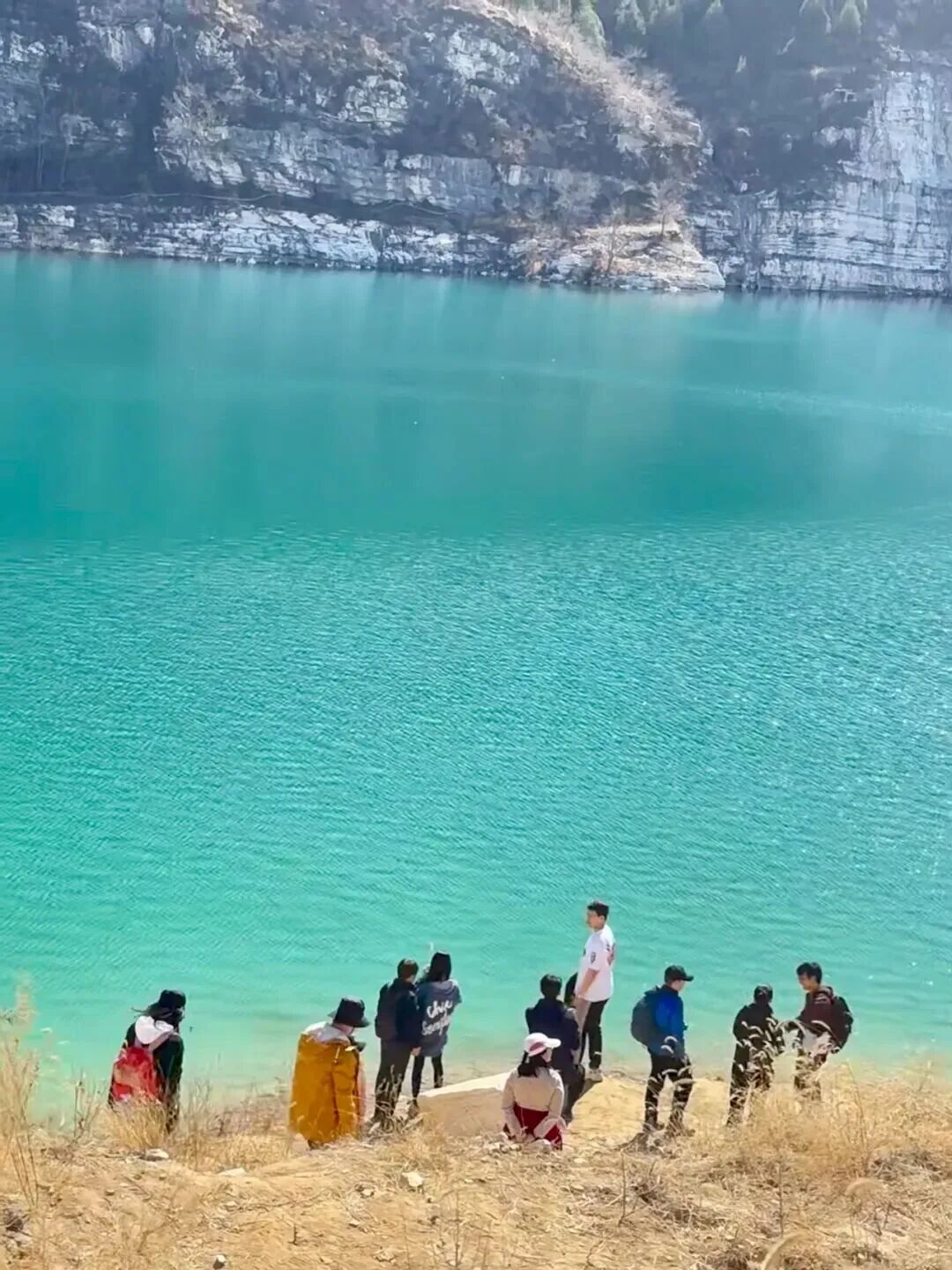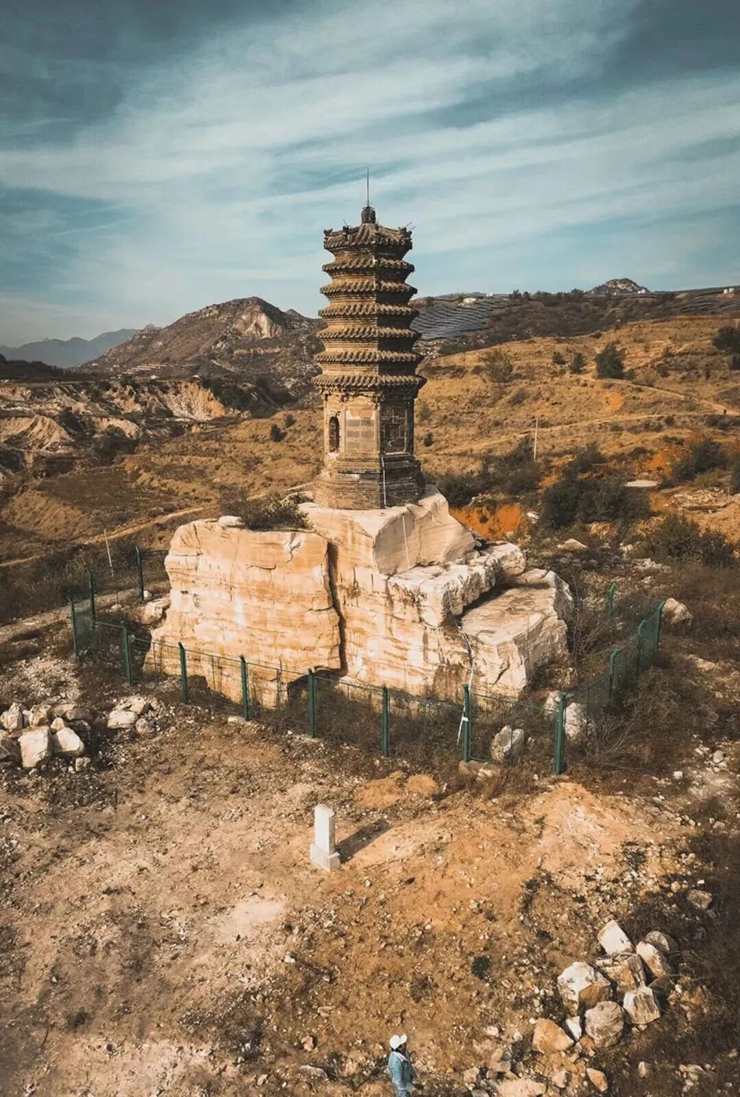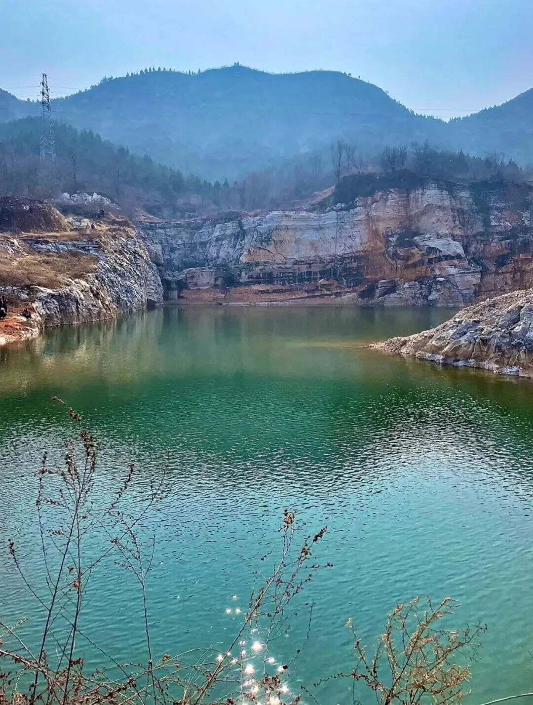 10:30|到达徒步起点,在领队带领下徒步前往翡翠湖。翡翠湖原来是有七眼泉,汉白玉之所以通体洁白无瑕、质地莹润细腻,是因为千百万年来,它都泡在水里。而随着大型无节制的开采,七眼泉中的五眼随之都干涸了,在矿区封停后不久,已经干涸的泉水又开始流淌出清泉,才有今日的翡翠湖美景!距离矿坑不远,在村北的山坡上有一座古塔,该塔建于辽代,坐北朝南,为八角七级密檐砖塔,通高15米。