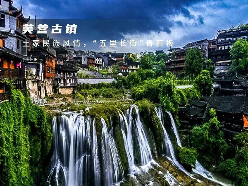 芙蓉镇是一个拥有两千多年历史的古镇,因宏伟瀑布穿梭其中,又称“挂在瀑布上的千年古镇”。这里被沈从文誉为山、水、木、石于一体最清奇、最美丽,有着挂在瀑布上“千年古镇”之誉。融自然景色与古朴的民族风情为一体的旅游胜地,土家吊脚楼、青石板路,细雨中倘佯于此沁人心脾。作为猛洞河风景区的门户,真是一个寻幽访古的最佳景点。观瀑吊脚楼收藏了土家族三百多件文物,具有浓郁的文化气息,是土家文明最好的一个体现,还有溪州铜柱、电影海报艺术馆也是游客必游之地。