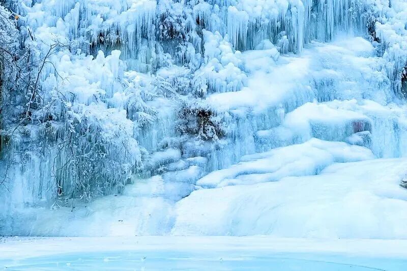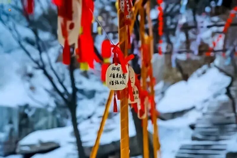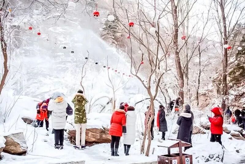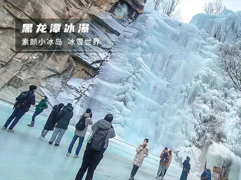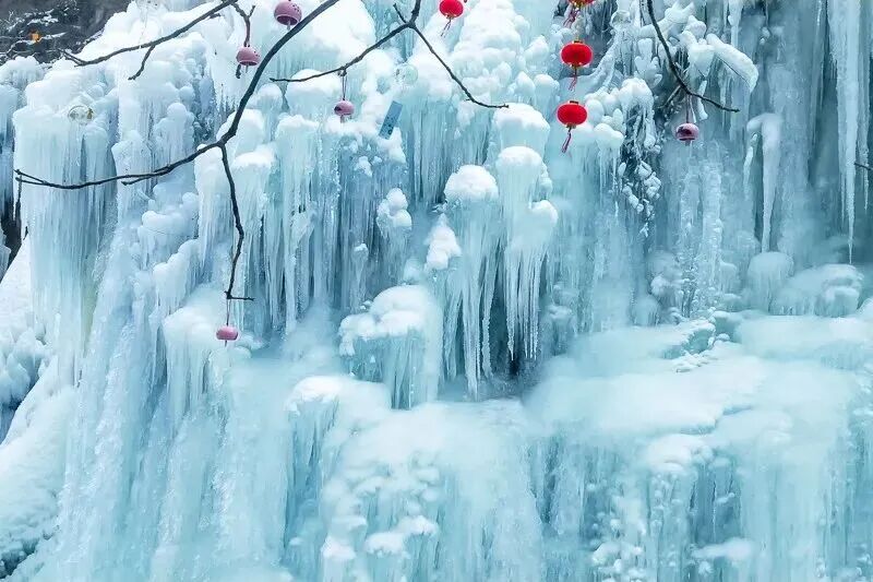 在全长4公里,水位落差220米的悠长峡谷中,长短不齐、大小不一、形状各异的冰挂、冰花晶莹剔透,昔日活跃的山泉瀑布此刻定格成冰瀑奇观,层层叠叠如玉雕般散落在峡谷各处。盘山栈道黑龙潭峡谷里轻轻摇荡,与冰瀑相映成趣,随风叮当作响,乐音响彻山谷。在这里,你可以见到很多网红小姐姐拍大片哟。
