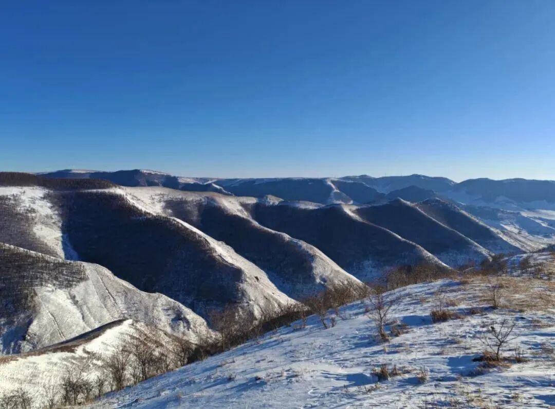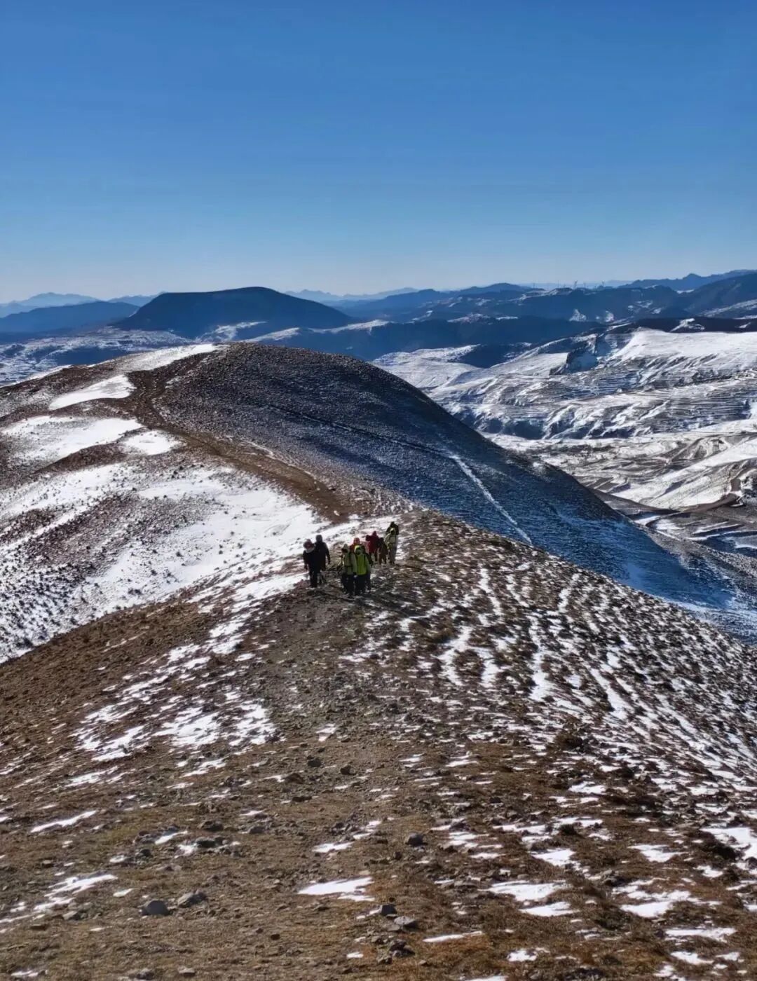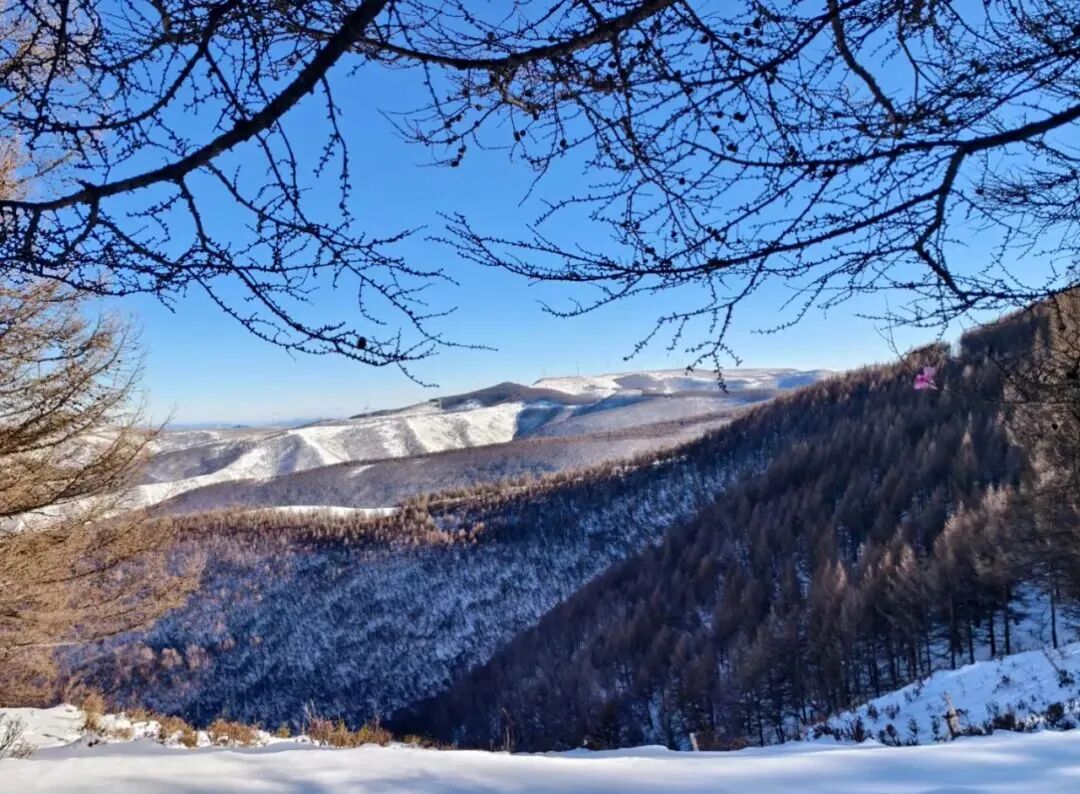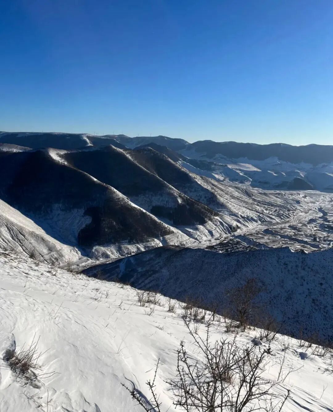 麻田的环穿只有10公里,难度不大,小天山山顶海拔2122米,麻田岭山脊向东连接东甸子梁,站在山项远望茶山,清浙可见,东南距离东甸子梁更是咫尺之遥,蓝天、白云、积雪,一幅天然的油墨画。