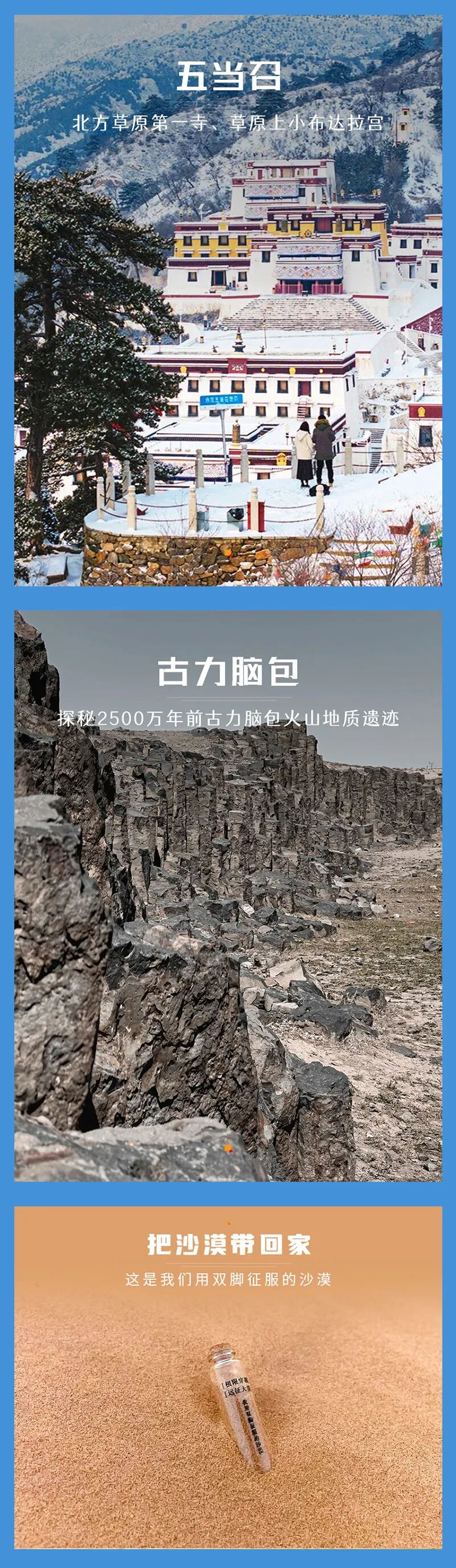 2)门票:西部梦幻峡谷门票60元+摆渡车15元,乌海湖68元(含往返摆渡车+网红枯树门票+网红公路打卡),五当召52元;其他景点暂无门票费用,如遇临时收费自理。门票价格供参考,以景区实际政策为准;