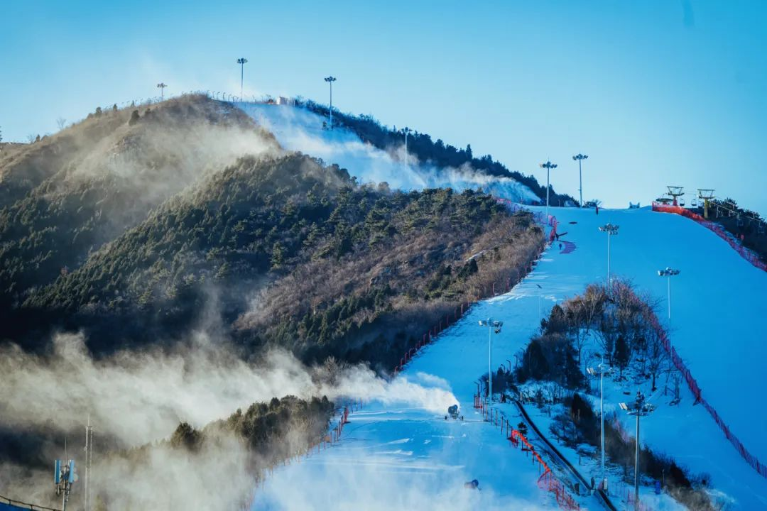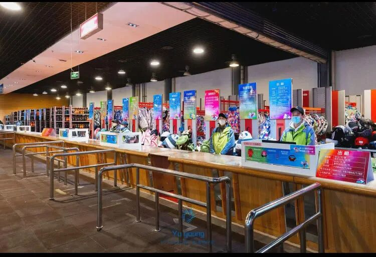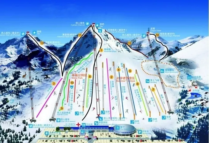 目前,滑雪场有高、中、初级雪道共12条, 雪道占地面积30余万平方米并配备双人缆车1条、 四人缆车1条,魔毯8条等先进的雪地运力设备 可同时满足高、中、初级不同滑雪人群的需求。 雪具大厅可使用面积达9000平方米, 为个人、团体、VIP客户提供理想的独立活动区域。 目前共有进口知名品牌雪服3200套、双板鞋6000双、 单板鞋3800双、双板5400副、单板2900块, 满足不同游客需求。