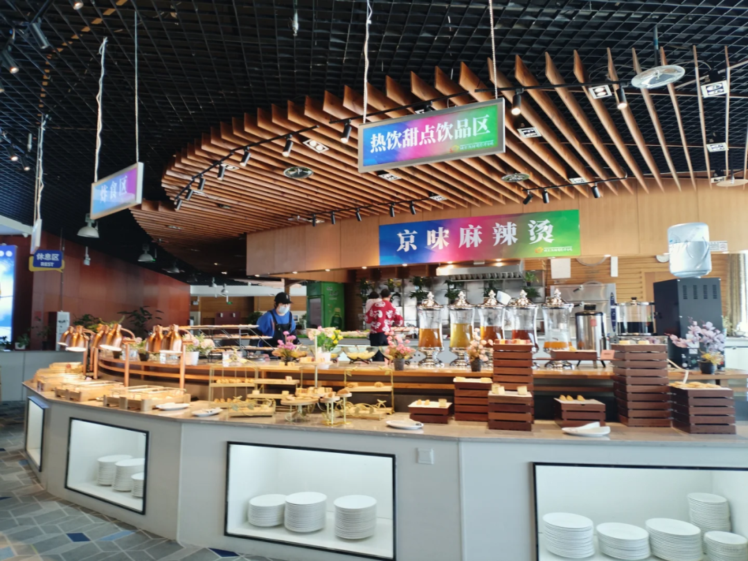 餐饮:大厅有免费的热茶水,二楼有自助餐厅,还有一个户外的美食广场,大厅两侧还有阳光房也有零食简餐卖,累了随便去哪里都可以免费休息,随时补充体力!