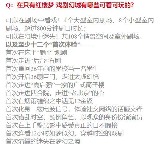2)门票:包含《只有红楼梦戏剧幻城》门票+15:30大剧《有还无》+微剧场+情景空间;套票不含床剧场/筒子楼剧场/读者剧场/真亦假,需另行单独购买。