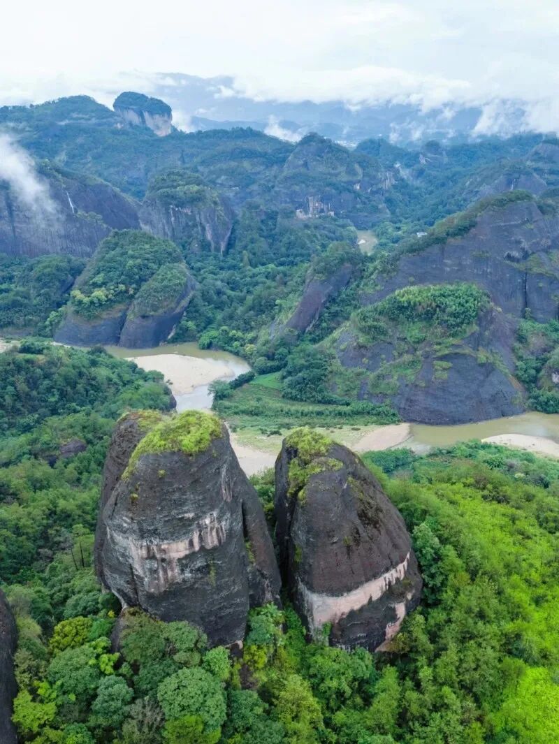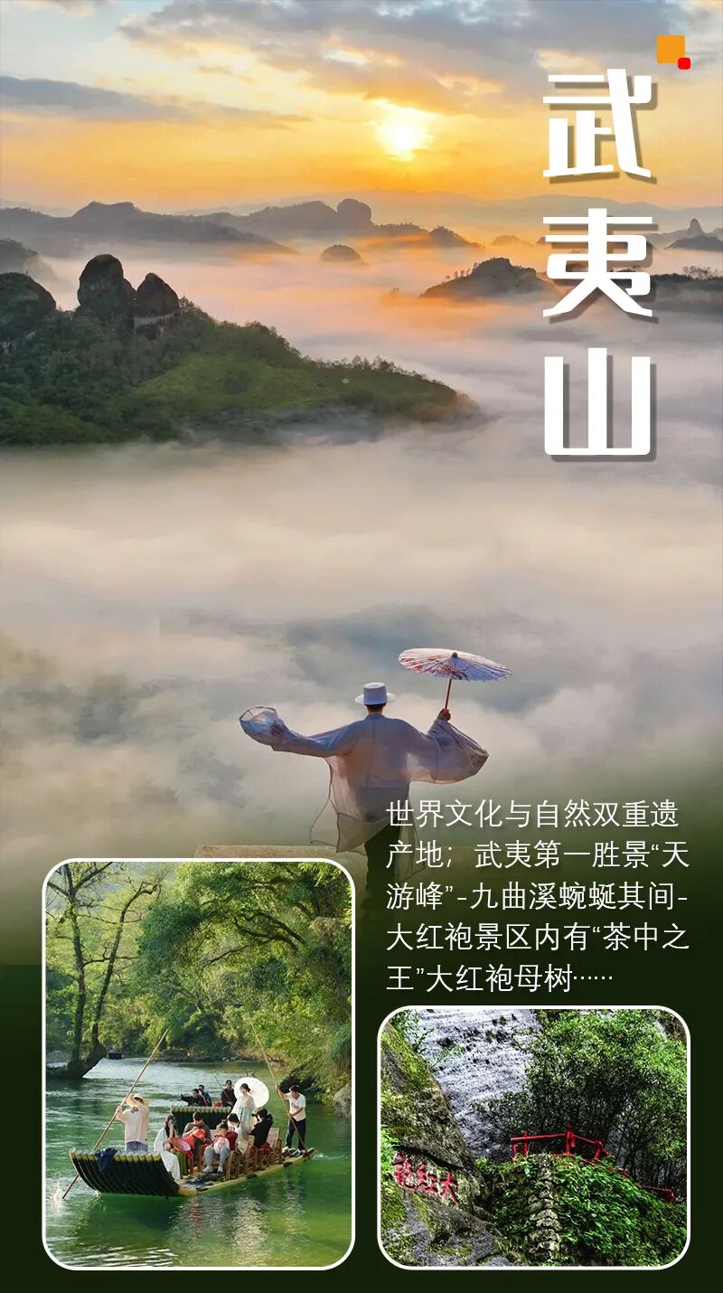 #武夷山世界自然与文化双重遗产,国家5A级景区,属典型的丹霞地貌,素有“碧水丹山”、“奇秀甲东南”之美誉。武夷山第一胜景天游峰,它独出群峰,云雾弥漫,山巅四周有诸多名峰捍卫,三面有九曲溪环绕,武夷全景尽收眼底。著名旅行家徐霞客点评“其不临溪而能尽九溪之胜,此峰固应第一也”,故有“武夷第一峰”之称。