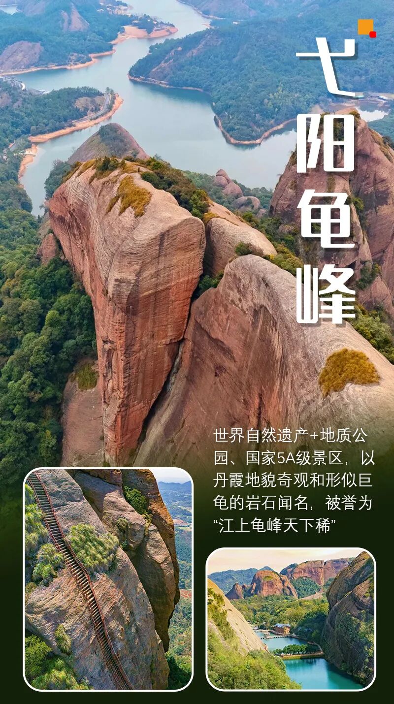 #龟峰龟峰风景名胜区是世界地质公园龙虎山—龟峰地质公园和世界自然遗产“中国丹霞”的组成部分,是国家级风景名胜区、国家AAAAA级旅游景区、国家森林公园、全国爱国主义教育示范基地。因景区内有无数形态酷似乌龟的象形石和整个景区远远看去像一只硕大无朋的巨龟而得名。素有“三十六峰七十二景”之说,集“奇、险、灵、巧”于一身,素有“江上龟峰天下稀”和“天然盆景”誉称。以其独特的“无山不龟,无石不龟”的自然景观和深厚的文化底蕴成为游圣徐霞客、电视剧《西游记》等众多名家名剧的推荐景点。