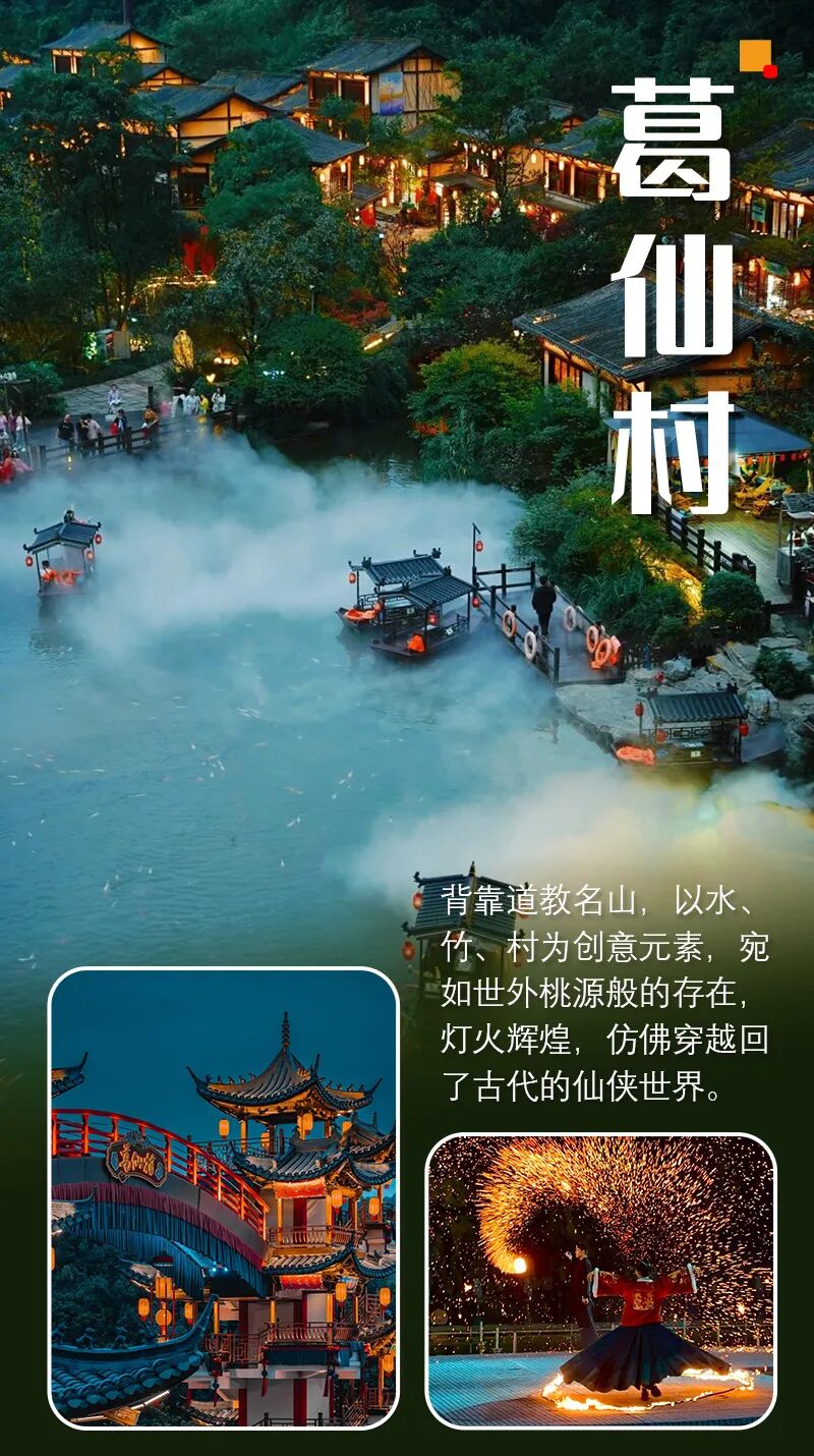 #葛仙村葛仙村度假区,按照国家5A级景区标准设计建设,以东汉末年葛玄在葛仙山的修行事迹为线索,融合中国传统文化内核和要素,结合古典山水画境,以水、竹、村为创意元素,致力打造一个集生态旅游、休闲度假、商务会展和传统文化体验的天然圣地和绝佳仙村。