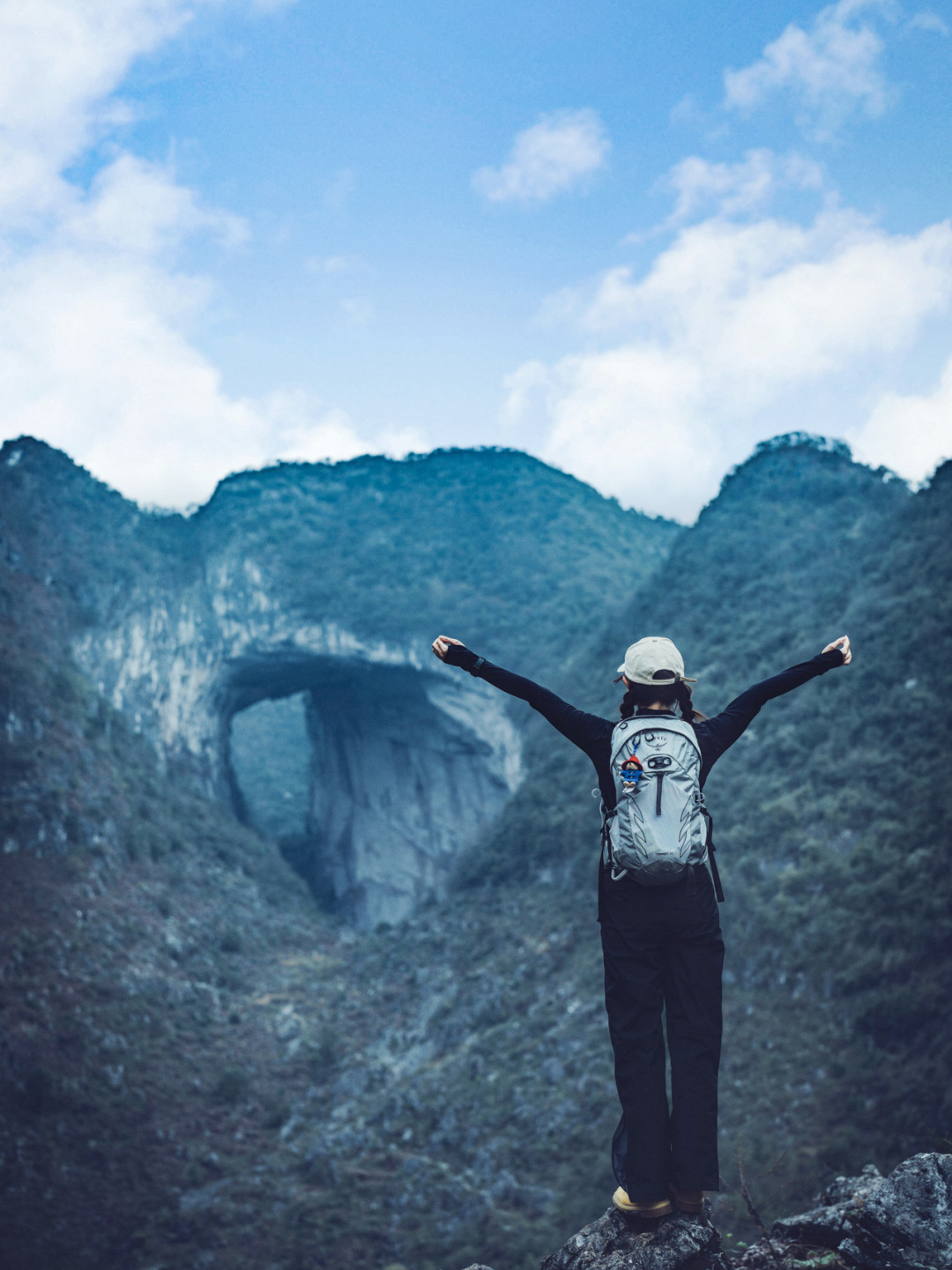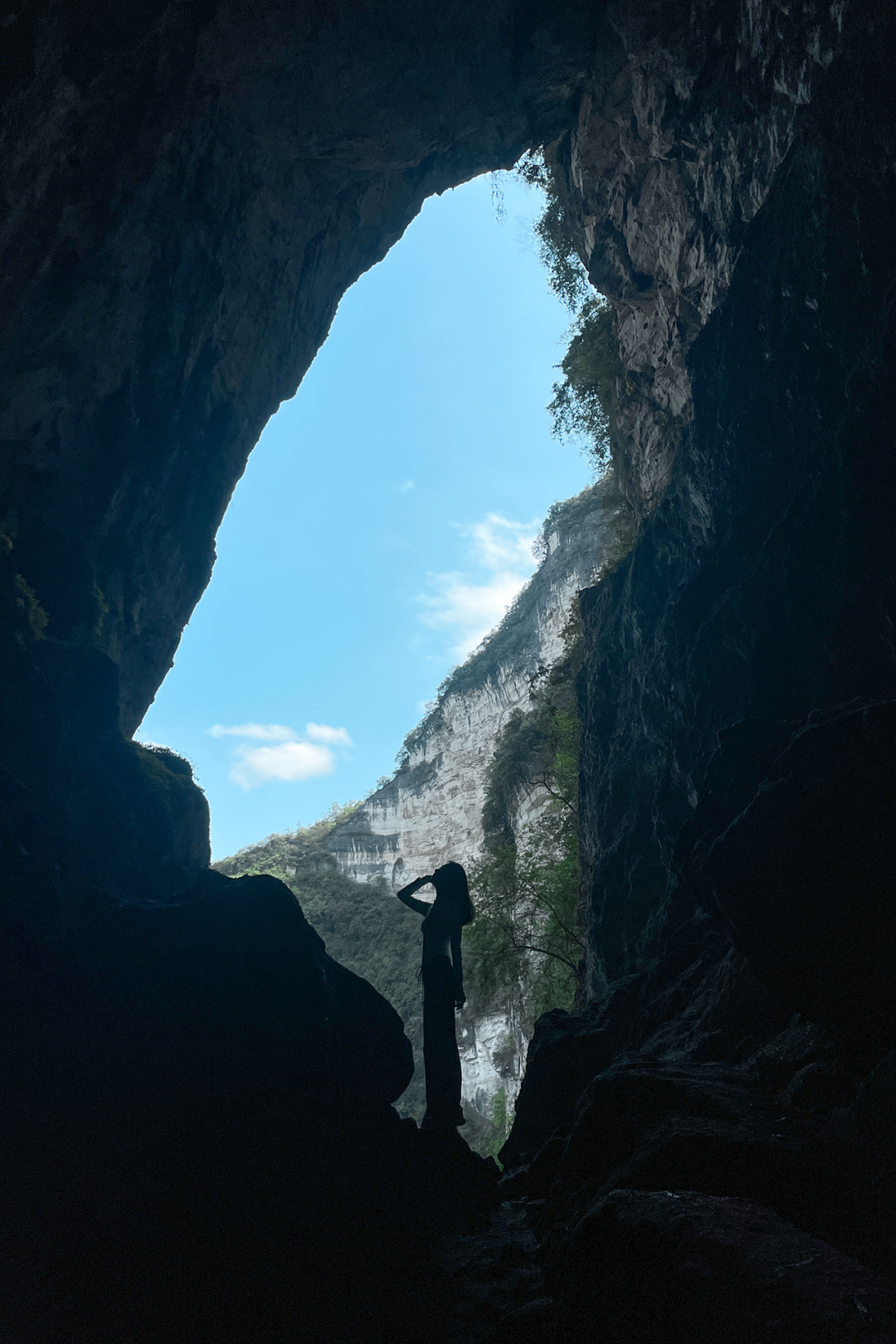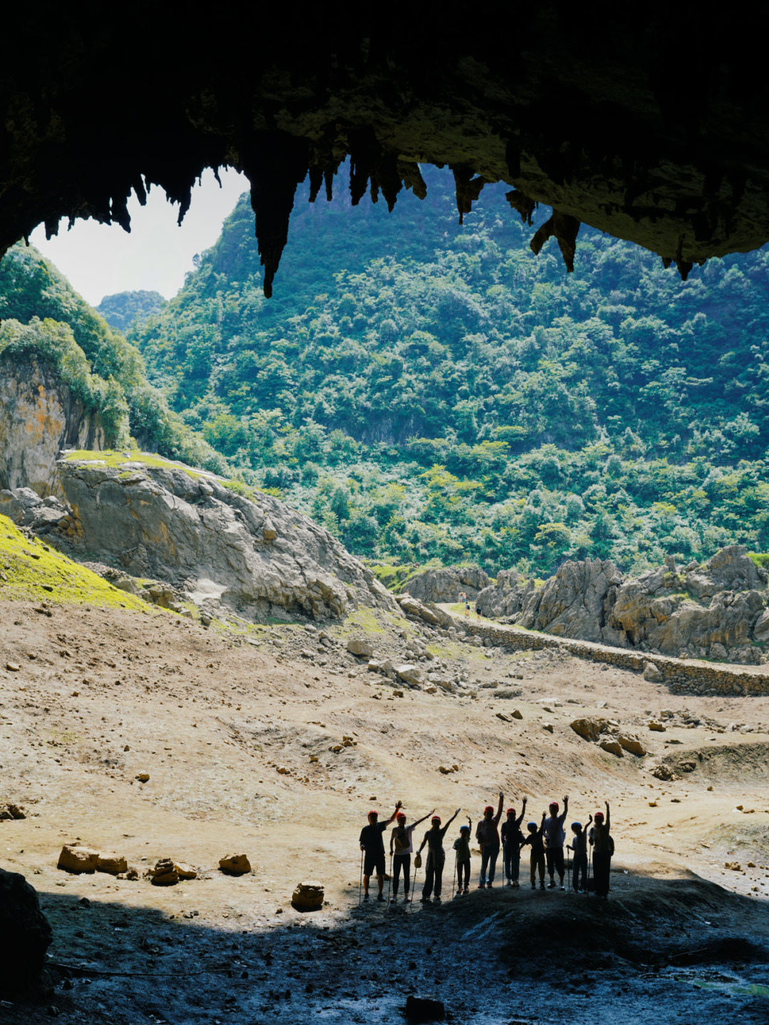下午走出溶洞继续翻越天坑谷地、乱石坡、灌木林前往第二处地下河、看大圣之眼、探密牛倒岩洞中瀑布、凹造型拍美照、看穿洞,随后出山沿乡道返回起点,乘车前往安顺市区入住酒店,结束当天的徒步行程。