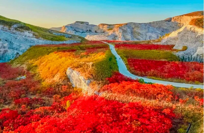 蒋福山是矿山和红叶的组合,被切割的山体,有一种残垣断壁的破碎美感,加上红叶的组合,不一样的风光。这里的红叶主要是火炬树、红枫树还有爬山虎。除了红叶,东边还有辽阔如大漠的风光。可以看骆驼、骑马、露营野餐、遛娃陪老人都没有难度。