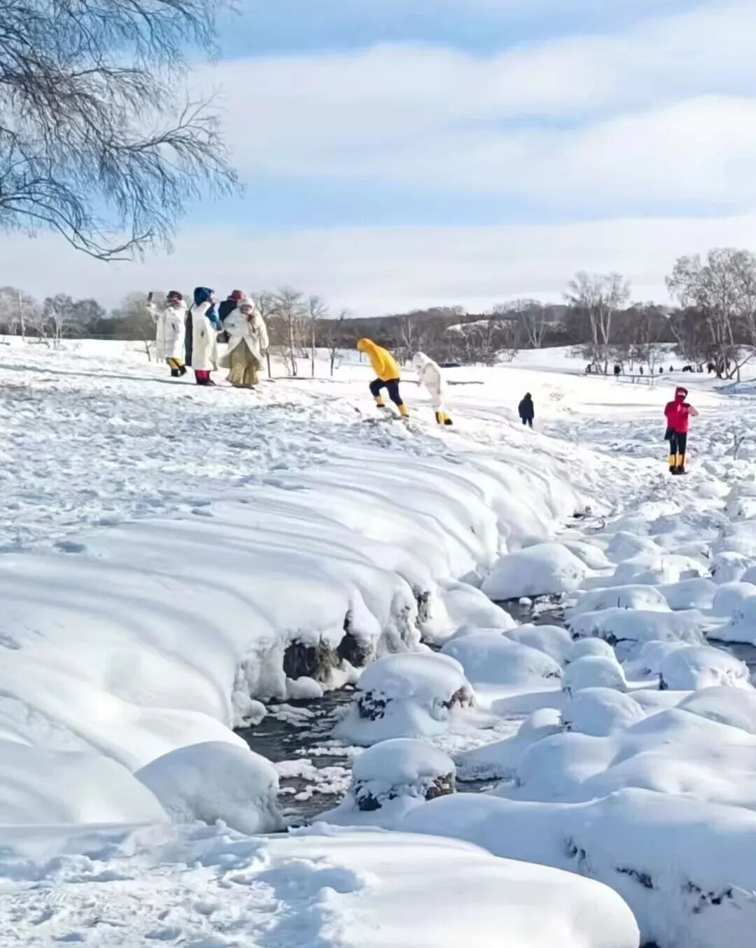 - 中午|我们到达萨岭河,号称水上高速公路!大家在此进行各项冰河运动,拔河、划圈、冰雪飘逸等,中午我们在此架起灶台,架起铁锅,炖香喷喷的肉,在此寒冷的冰雪草原,吃上热气腾腾的铁锅炖是何等享受。