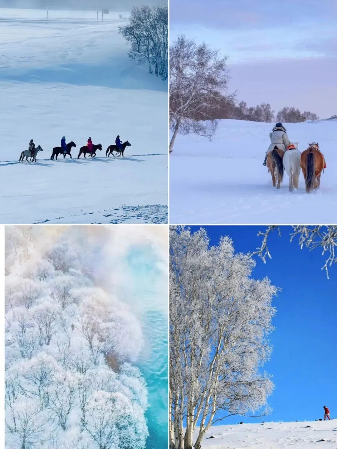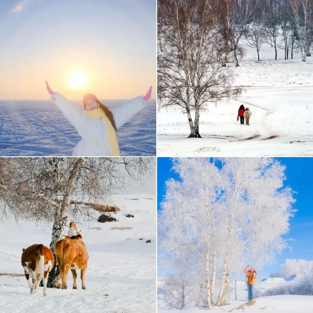 - 前往拍摄雪地狂奔的马群(费用自理),马倌会根据大家的拍摄角度让追赶着马儿奔跑在辽阔的大草原之上。冬季拍摄雪地奔马场面远远好于夏秋季节奔马的场面,拍摄马匹在雪地奔跑,鬃毛、马尾、溅雪、哈气的画面层次动感强烈,气势磅礴。- 『小河头』这里因为有一条冬夏从不干枯的小河,因此人们习惯称之为小河头。冬天的小河头有活水流趟,河中有水草塔头,上有白雪覆盖,形状各异,在河中飘浮。另外,小河头冬天有明冰,冰上有河柳灌木,早晚并有水雾形成,河的两岸有白桦。冬季极易有雾凇出现,非常适合早晚拍摄日出日落和白桦小景。