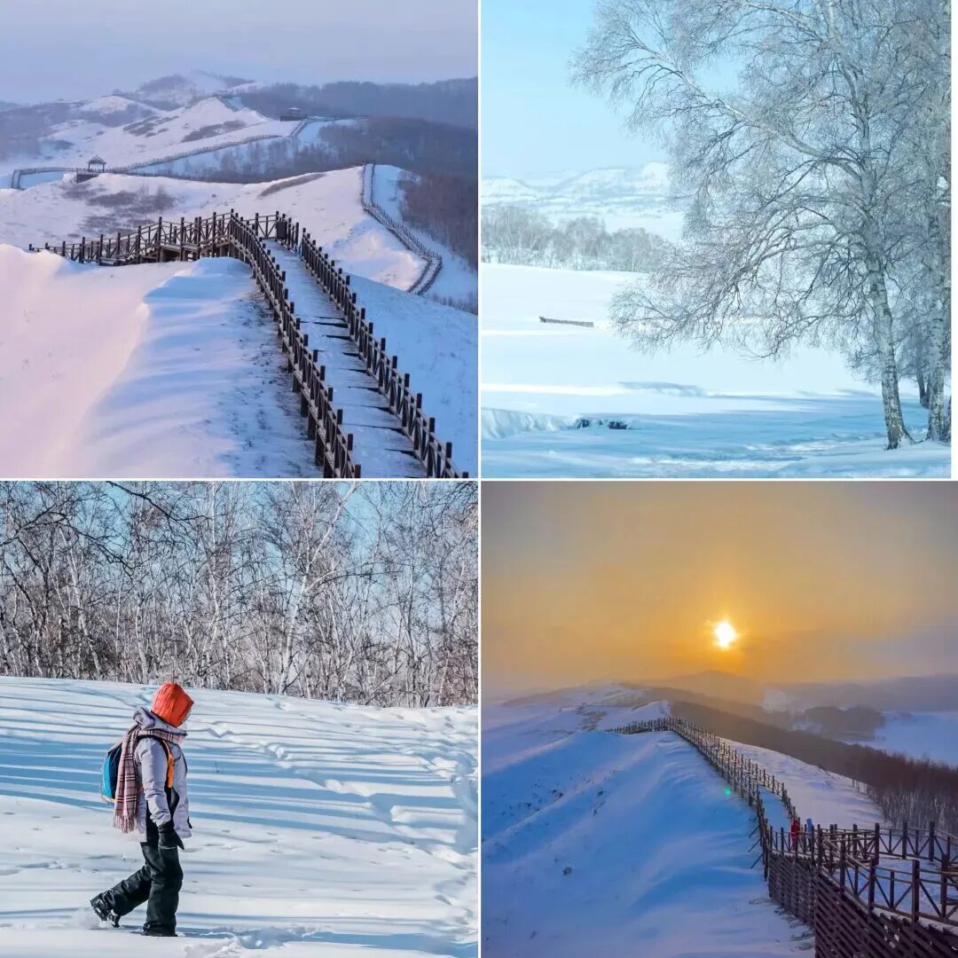 「乌兰布统影视基地」登上木栈道观雪域全貌, “北国风光千里冰封,万里雪飘的风光瞬时呈现,登上木栈道入眼帘,银装素裹的雪原分外妖娆。沿木栈道感受欧式雪原的起伏,夕阳西下,冬日柔和的日光穿过云层将整个天空和大地染成温柔的粉色。这就是北方冬天带来的浪漫。