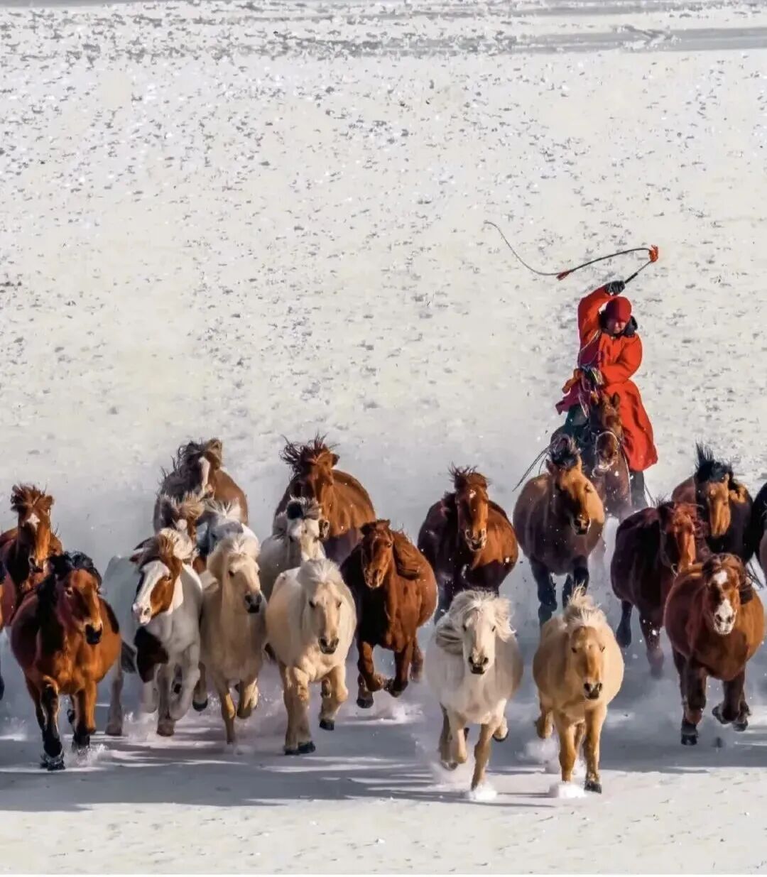 「万马奔腾」拍摄跑马是乌兰布统草原的特色之一,很多摄影爱好者拍过夏秋季节“万马奔腾”过河的壮观场景,“马踏水花”的照片令人印象深刻。而冬季里,在壮阔的雪原之上,近百匹马疾驰而来,马蹄扬起飞雪,在后面甩出一片白雾,其气势比之夏秋季节有过之而无不及。