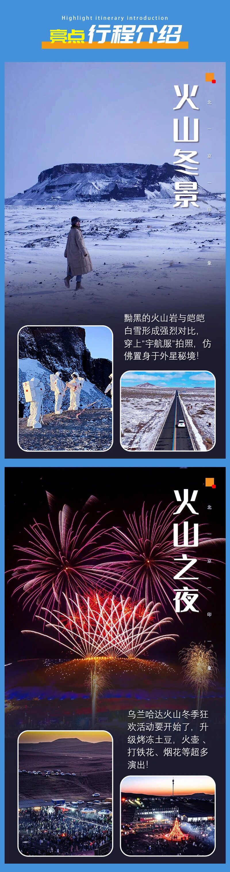- 晚上我们参加乌兰哈达火山冬季逛欢夜, 到时候还有千人烤土豆、烤锡纸盲盒!晚上还有火壶表演、乐队表演、小金豆跳舞,最后是万人合唱烟花秀!(表演安排具体以景区安排为准,可能有所调整)相当精彩!这个假期去乌兰察布火山去去班味儿吧!
