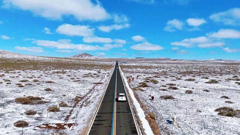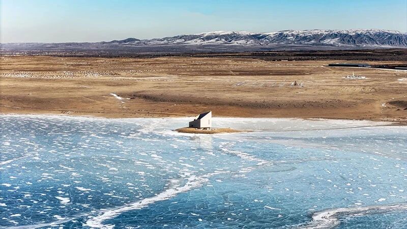 涝利海冬季化身为乌兰察布荒原上的冰封秘境,位于兴和县鄂尔栋镇,这片天然湖泊在严寒中凝结成巨大的天然镜面,四周草场覆盖着枯黄草甸与斑驳积雪。气温可降至零下20摄氏度以下,湖冰厚度可达一米,冰层中镶嵌着冬季限定的气泡冰奇观,冰面裂纹如同大地的脉络。晴日里,阳光在冰面上折射出钻石般的光芒,晨昏时分低斜的阳光将冰面与雪野染成金粉色。湖南岸的“物生其地”民宿建筑群点缀于雪野中,其飞碟造型的观景台和湿地上的教堂为寂静的冬景增添了艺术气息。北岸仍有牛羊骏马在雪地中徜徉,牧民的身影与勒勒车辙在雪原上划出悠长曲线。探访需备足防寒衣物,特别注意防风保暖。